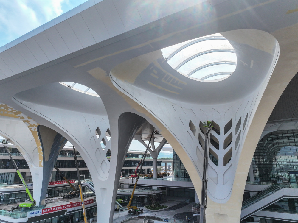 4月30日,工人在重庆东站建设现场施工(无人机照片)。新华社记者 唐奕 摄