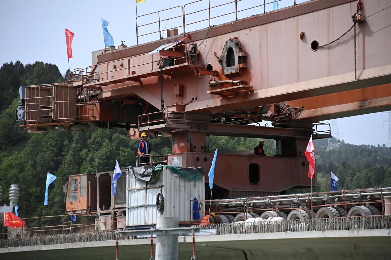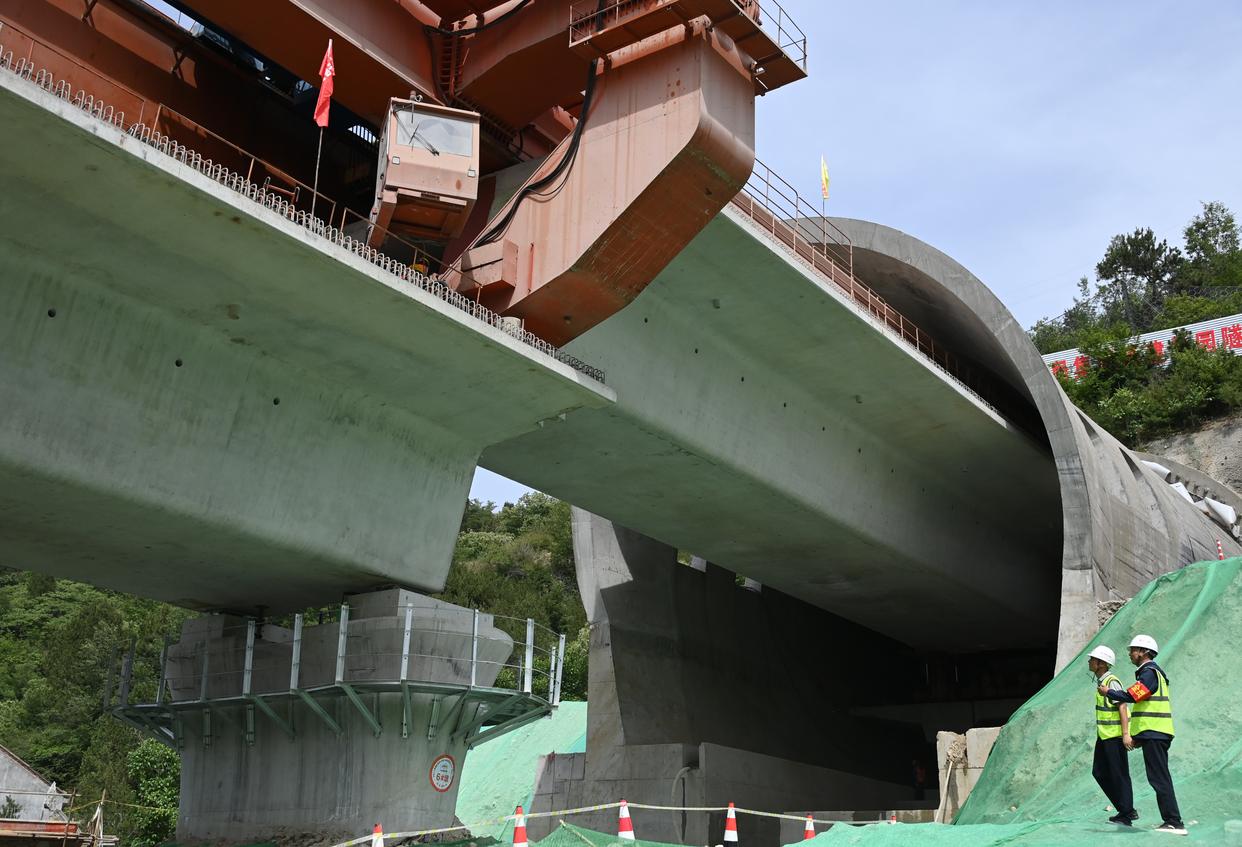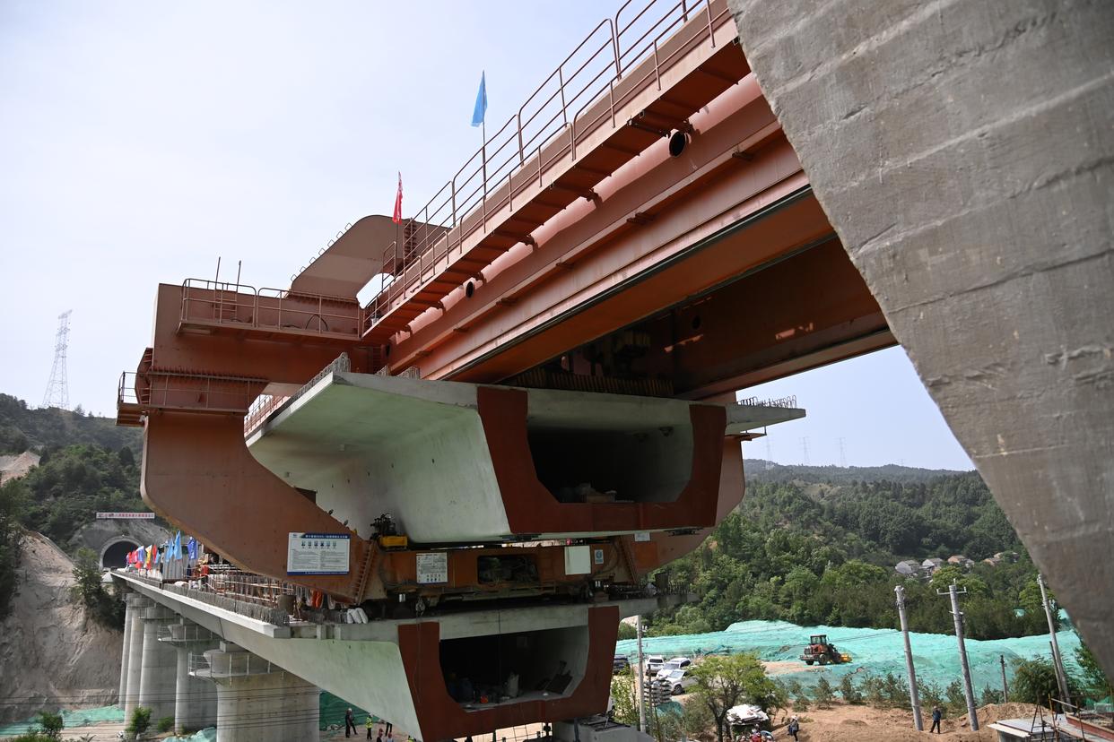 5月18日,施工人员在龙凤坡大桥上架设西十高铁全线最后一孔箱梁。新华社记者 李一博 摄