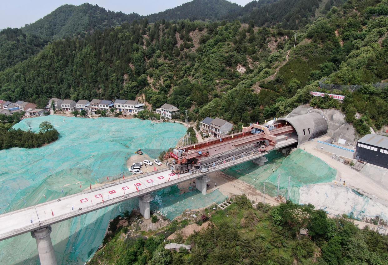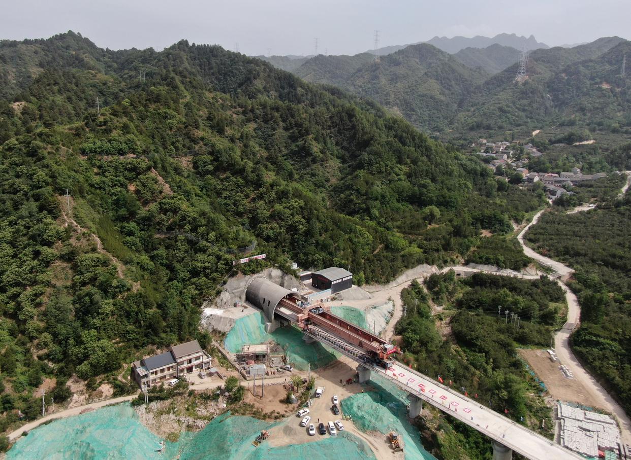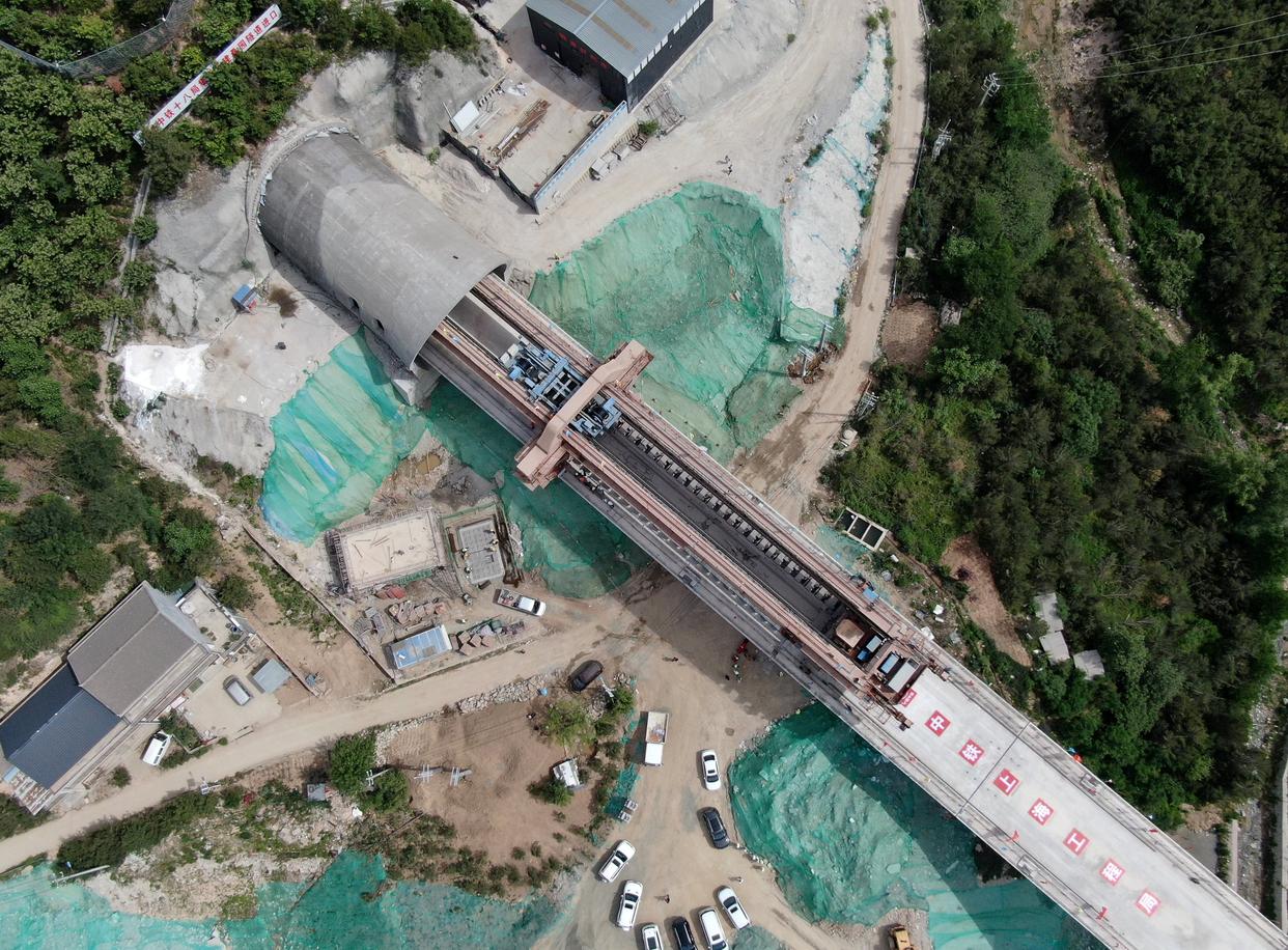 5月18日,施工人员在龙凤坡大桥上架设西十高铁全线最后一孔箱梁(无人机照片)。新华社记者 李一博 摄