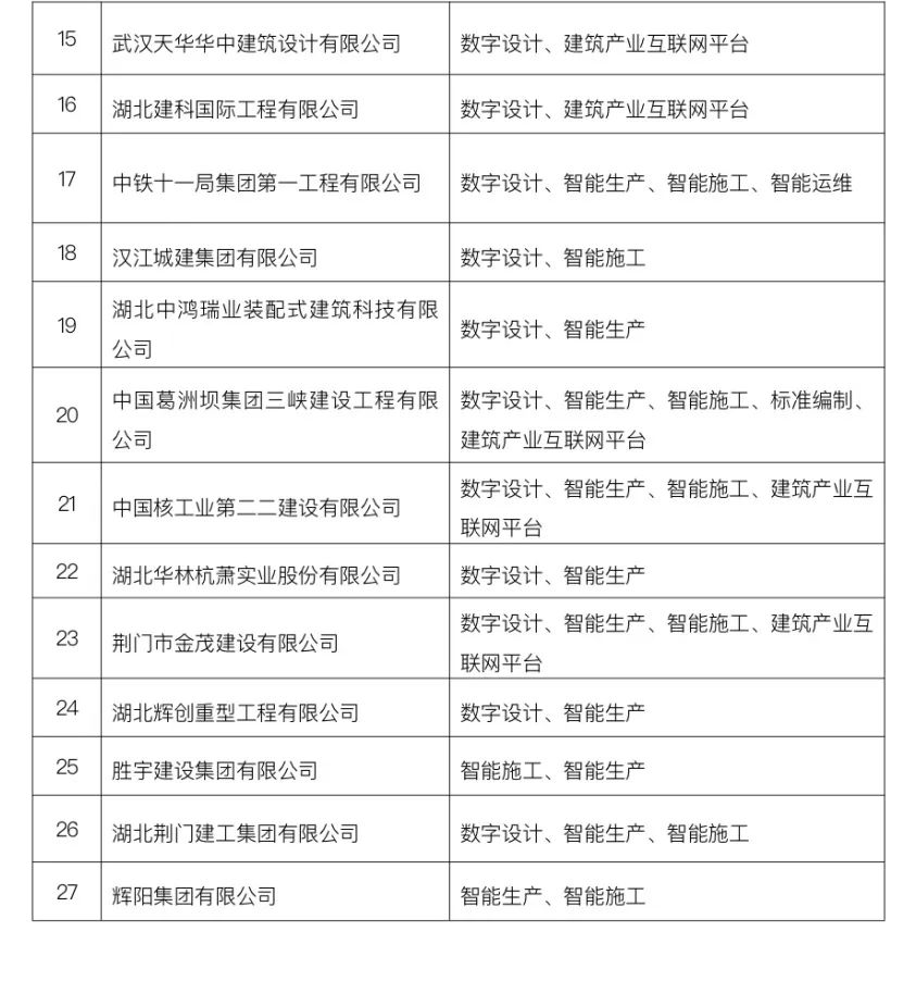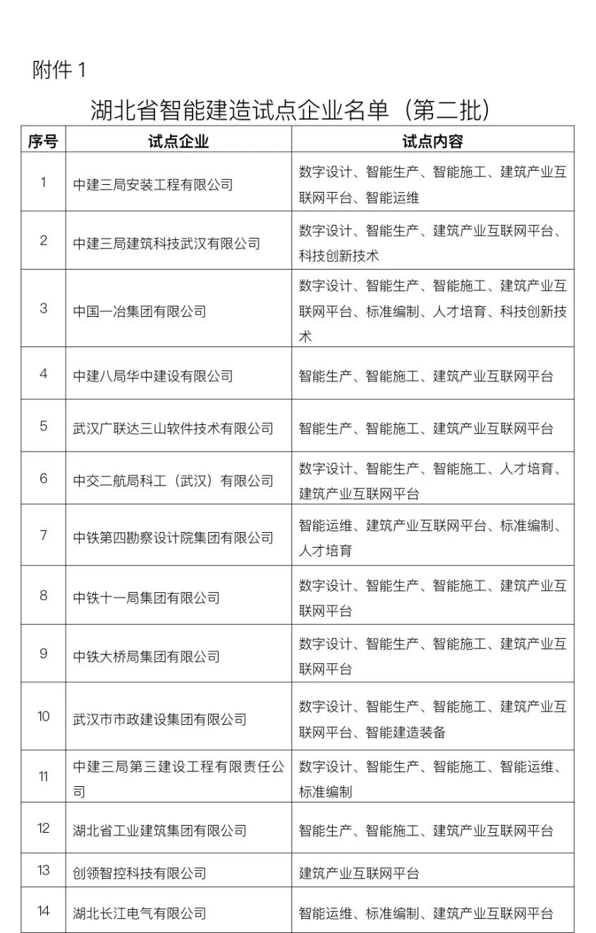 近日,湖北省住建厅发布第二批智能建造试点企业和项目名单,共27家企业、75个项目入选,覆盖全省,涉及数字设计、智能生产、智能施工、智能运维、建筑产业互联网等全生命周期流程各个环节,进一步推进智能建造工作在全省范围扩面提质。