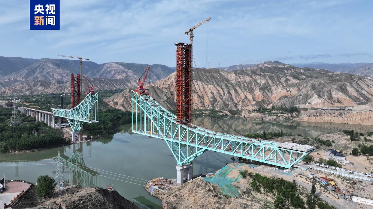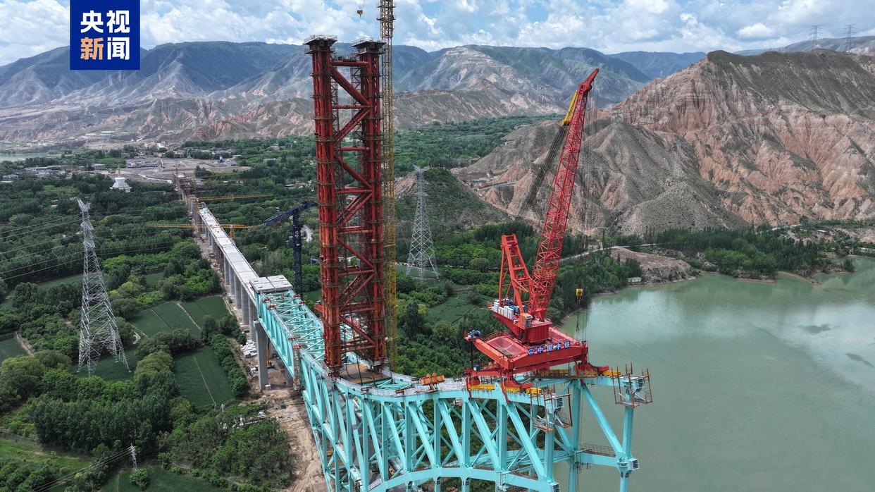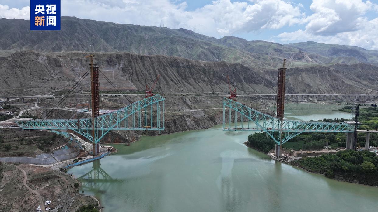 今天,我国首座跨越黄河的铁路钢桁拱桥——青海尖扎黄河特大桥吊索塔架实现封顶,正式进入主桥合龙冲刺阶段。
