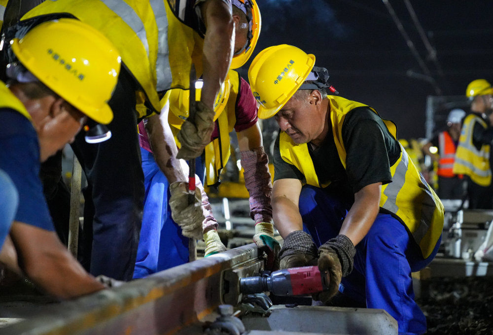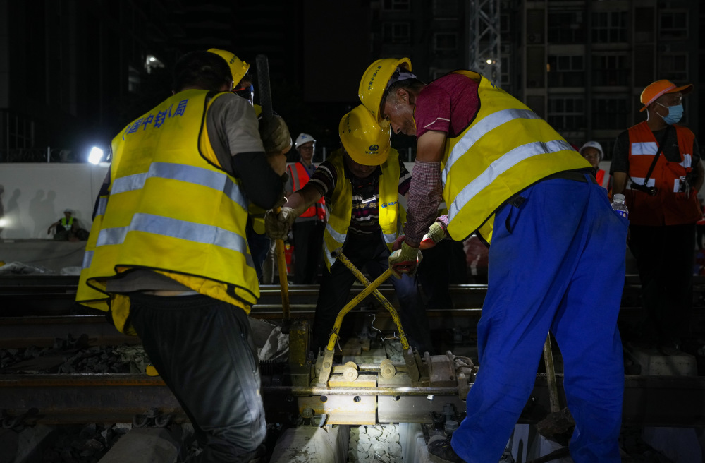 6月19日,在成渝中线高铁成都站南北站场交替施工现场,中铁八局施工人员在南站场拨接新的轨道。新华社记者 江宏景 摄