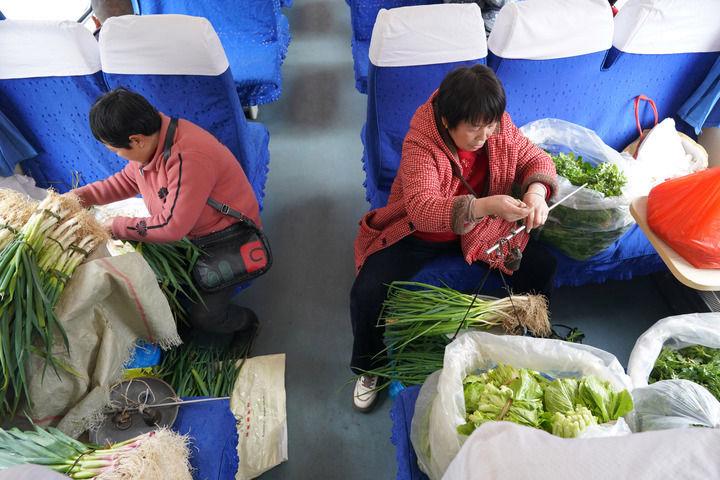 2月17日,两名乘客在6064次列车上整理蔬菜。新华社记者 邵瑞 摄