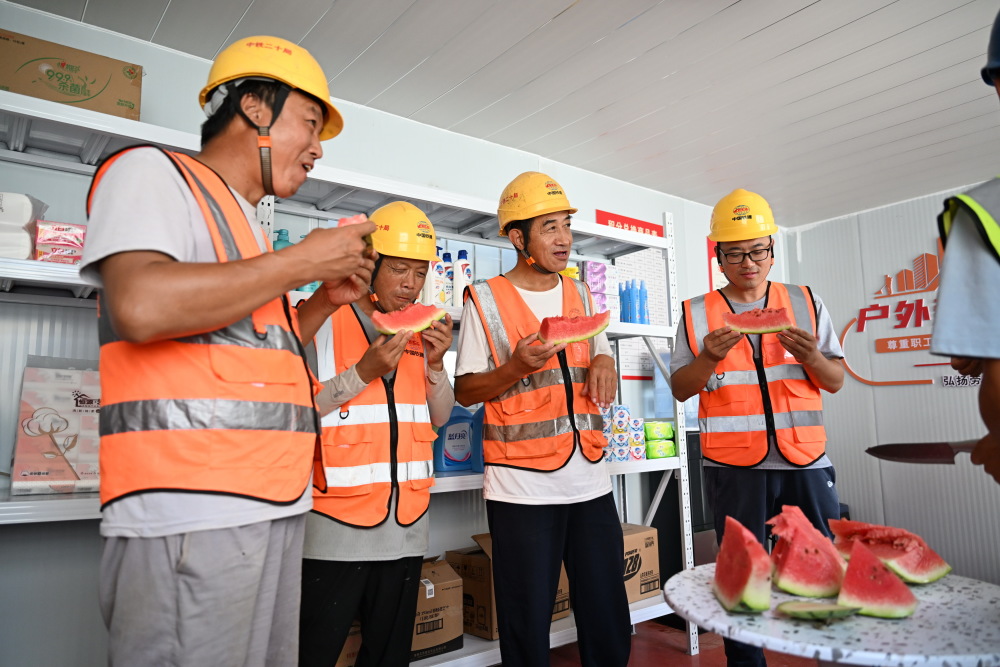 8月3日,中铁二十局工人在石家庄市城市轨道交通5号线一期03工区工会驿站内吃西瓜解暑。新华社记者 牟宇 摄