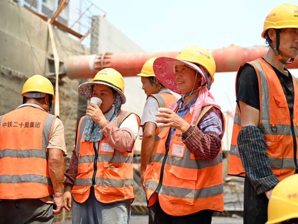 在石家庄市城市轨道交通5号线一期工程建设现场,中铁二十局集团等承建单位通过调整劳动作业时间、加强防暑降温等措施,保障工程建设有序推进。