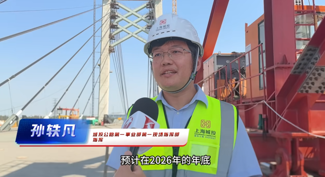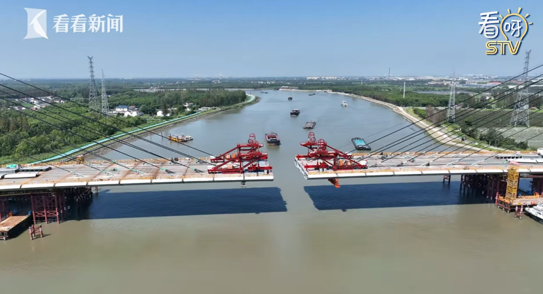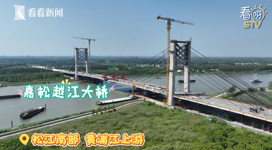 嘉松公路越江大桥全长约1.45公里,主桥采用双塔双索面自锚式悬索桥桥型,主跨跨径336米; 主塔造型以江南建筑窗花艺术为原型并融入中国结元素,总高约90米; 引桥为标准跨径小箱梁梁式桥,将采用全预制拼装技术施工。