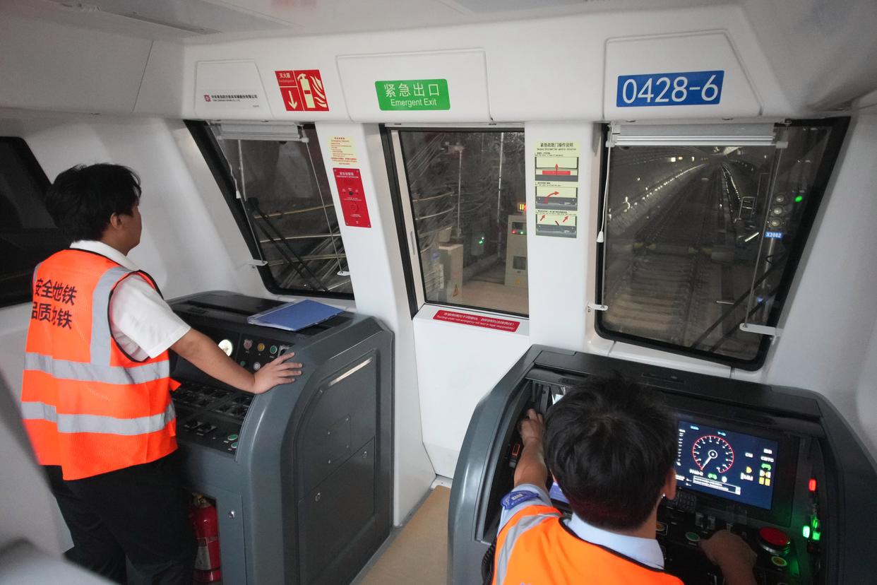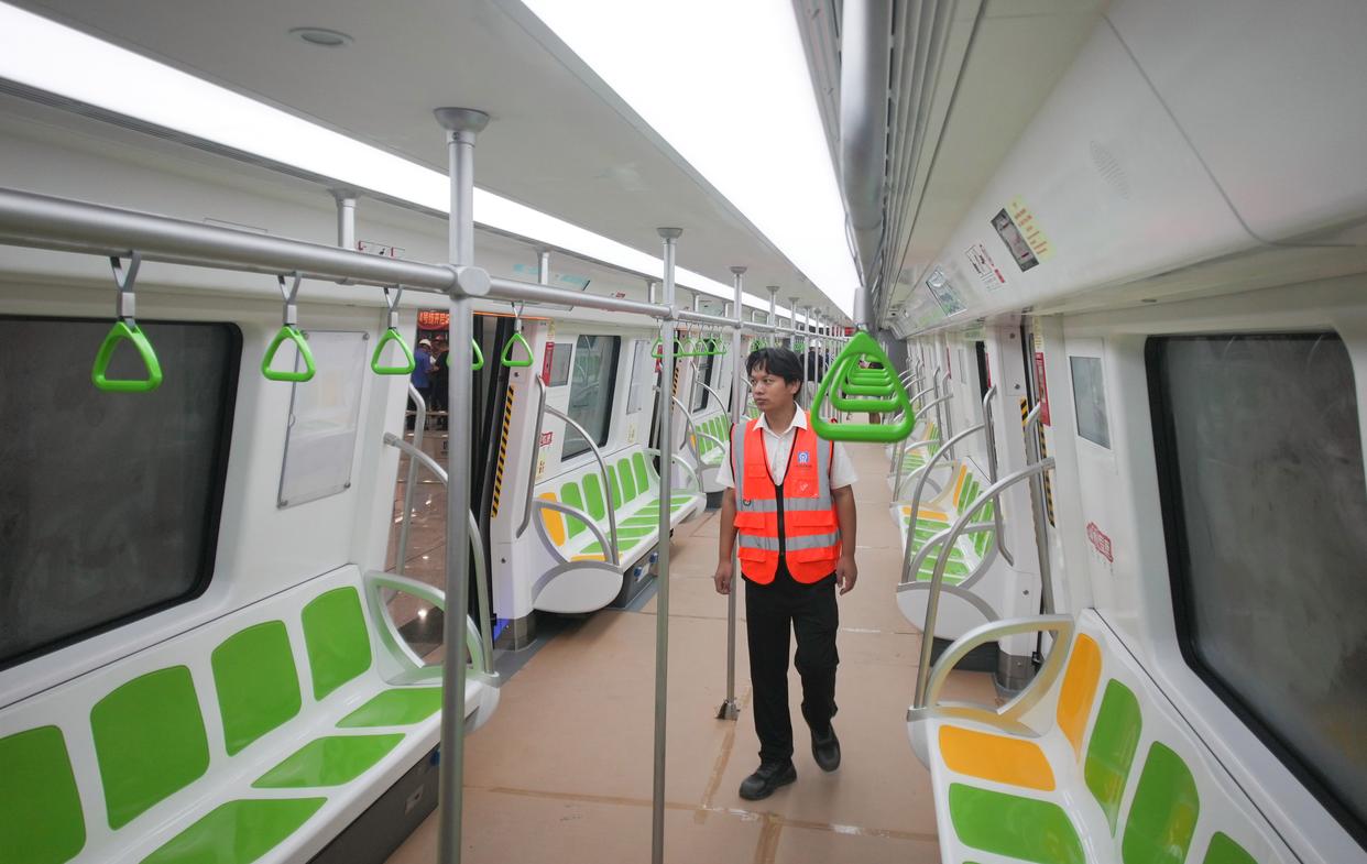 8月31日,济南地铁工作人员在试运行的地铁4号线列车内查看。新华社记者 徐速绘 摄