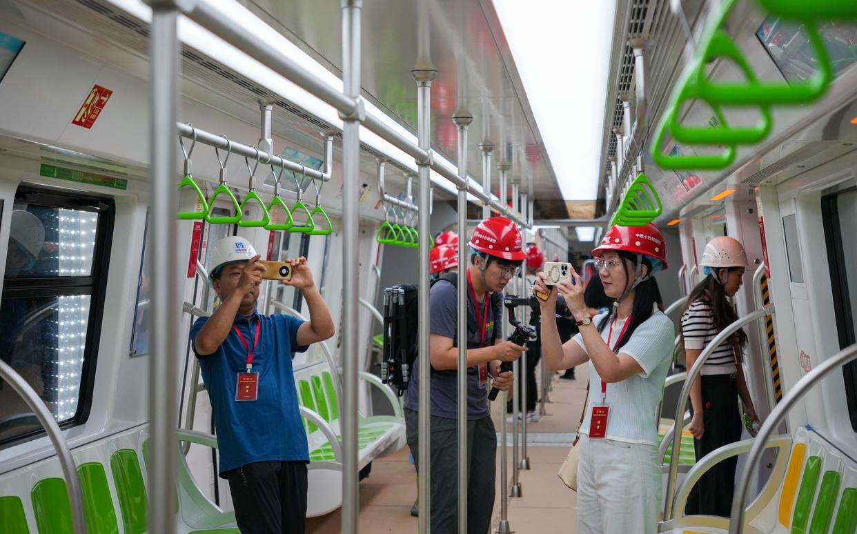 8月31日,在济南地铁4号线唐冶南站,市民代表和媒体记者在地铁列车内参观。新华社记者 徐速绘 摄
