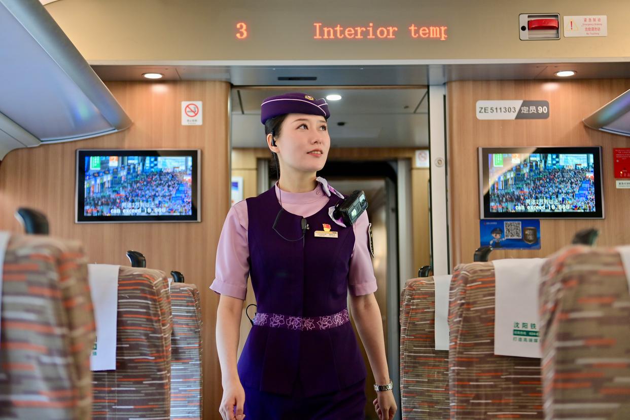 9月4日,G9121次列车乘务员在列车上工作。新华社记者 吴青昊 摄