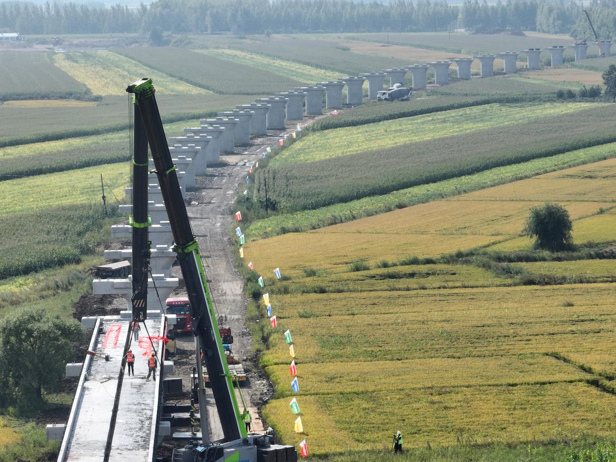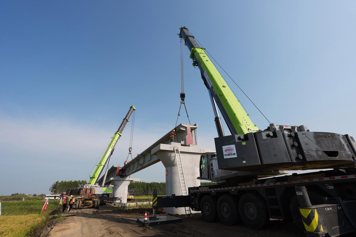 这是9月5日拍摄的佳木斯至同江铁路扩能改造工程同江特大桥架梁施工现场。新华社记者 王松 摄
