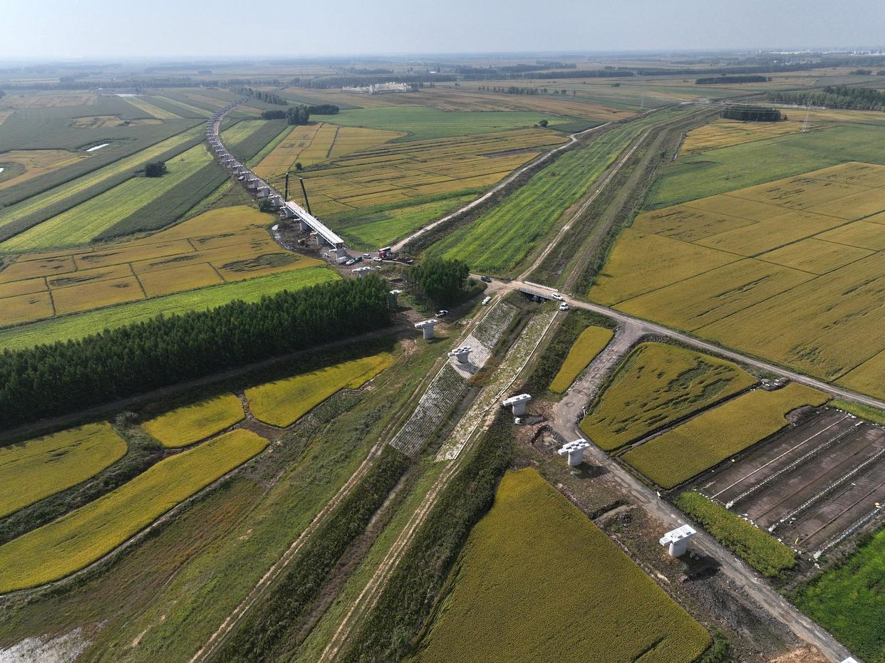 这是9月5日拍摄的佳木斯至同江铁路扩能改造工程同江特大桥架梁施工现场(无人机照片)。新华社记者 王松 摄