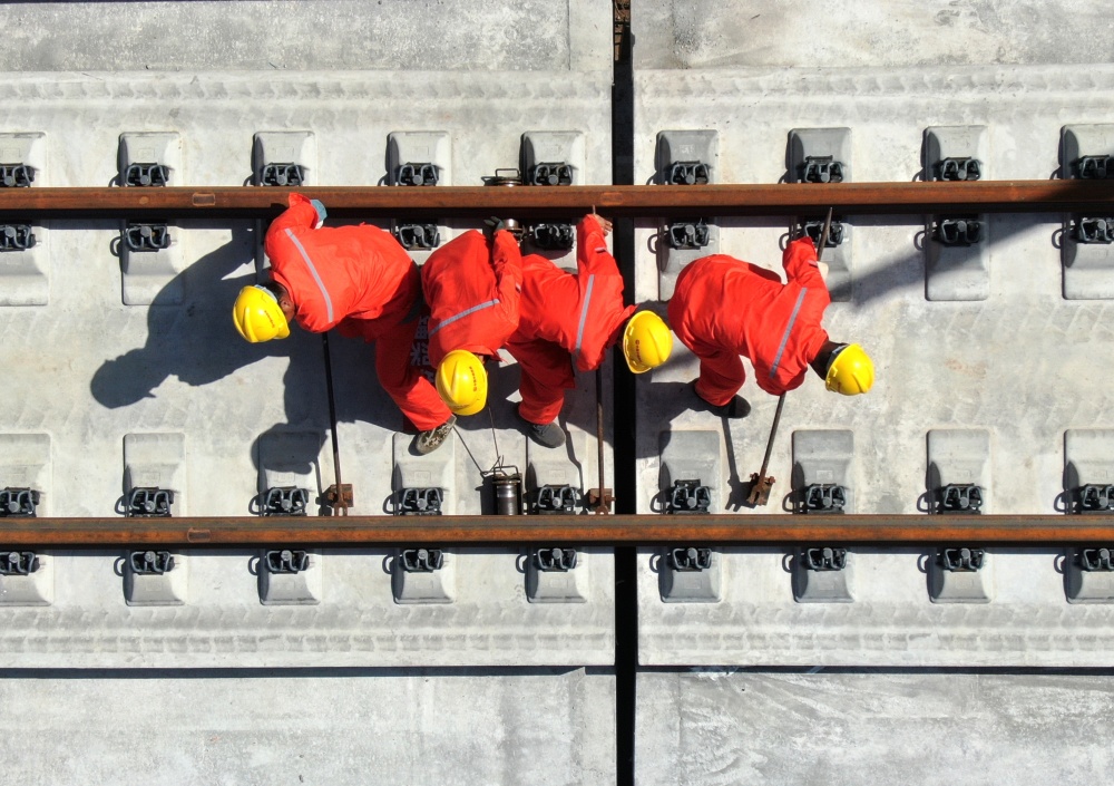 9月8日,施工人员在西十高铁西安东至蓝田区间铺设无缝钢轨(无人机照片)。新华社记者 李一博 摄