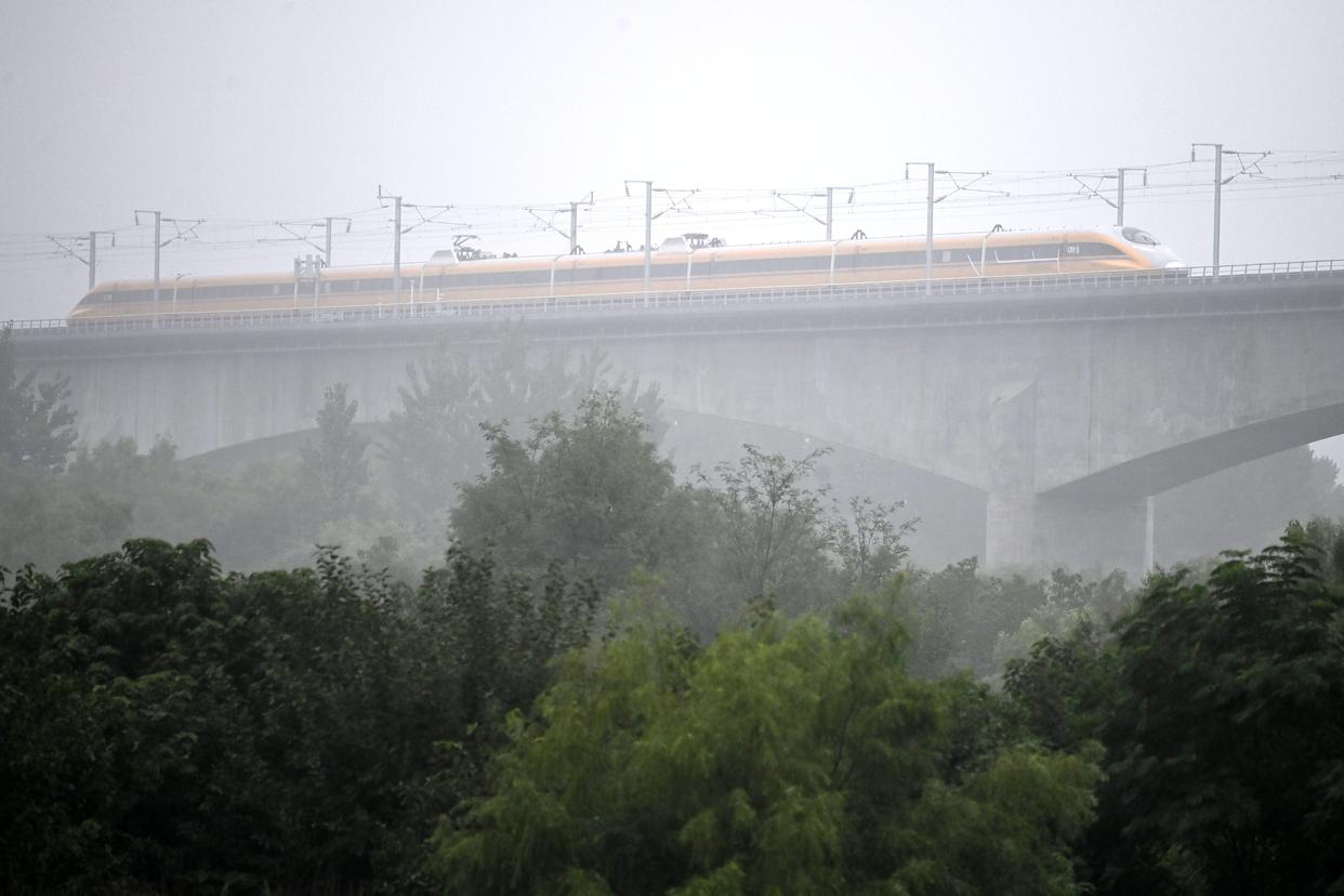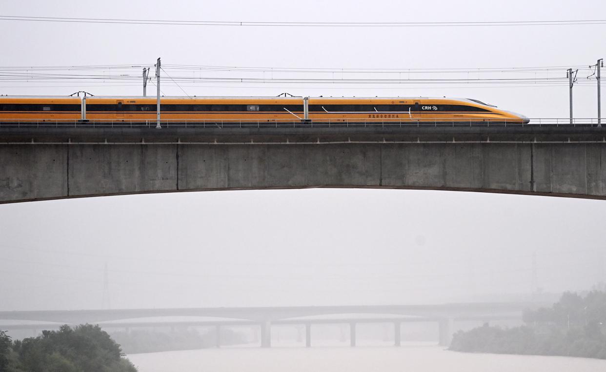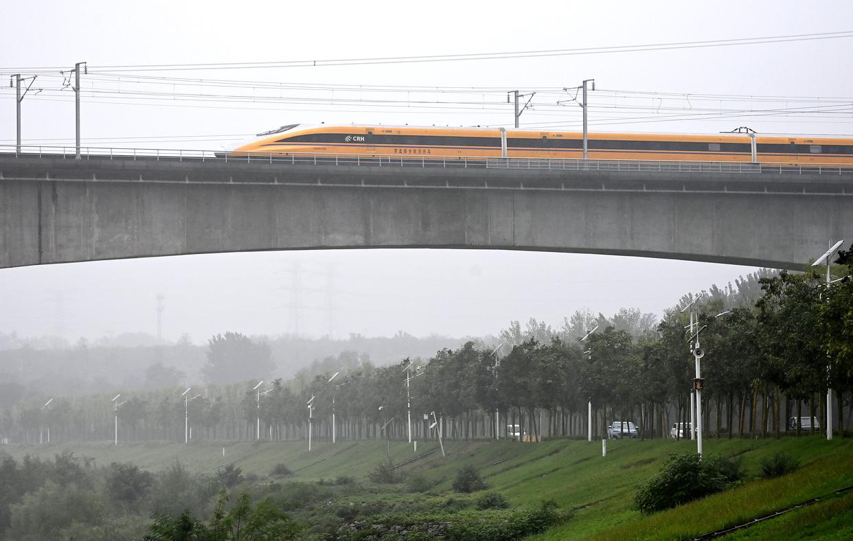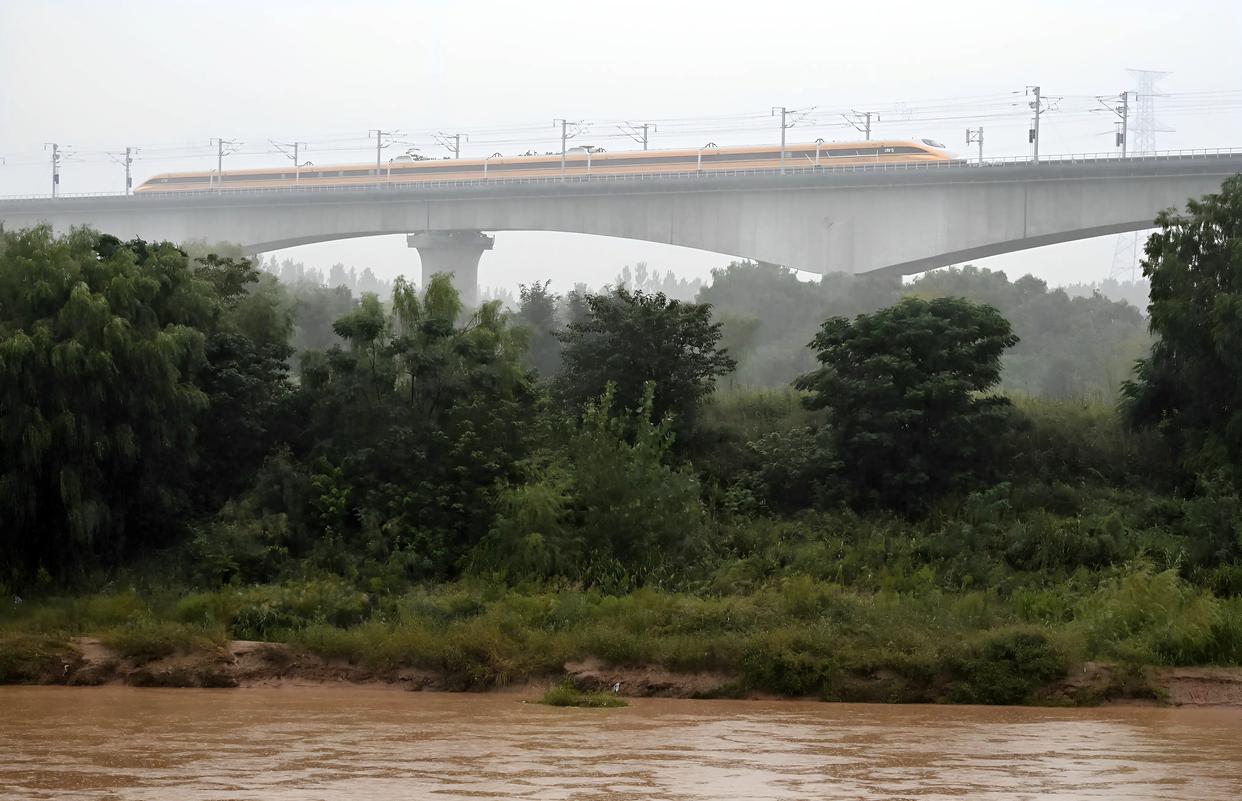 9月11日,联调联试综合检测列车驶过位于陕西省西安市的西延高铁渭河特大桥。新华社记者 李一博 摄