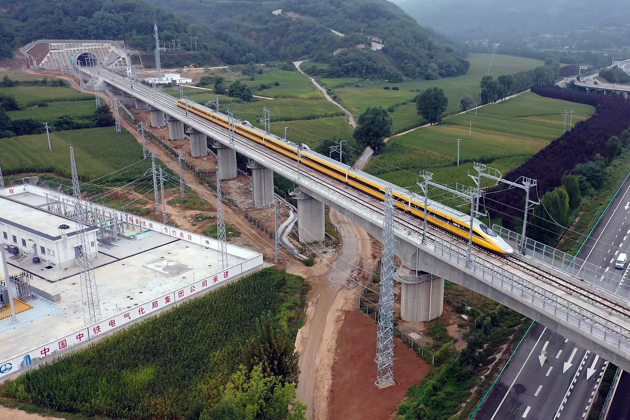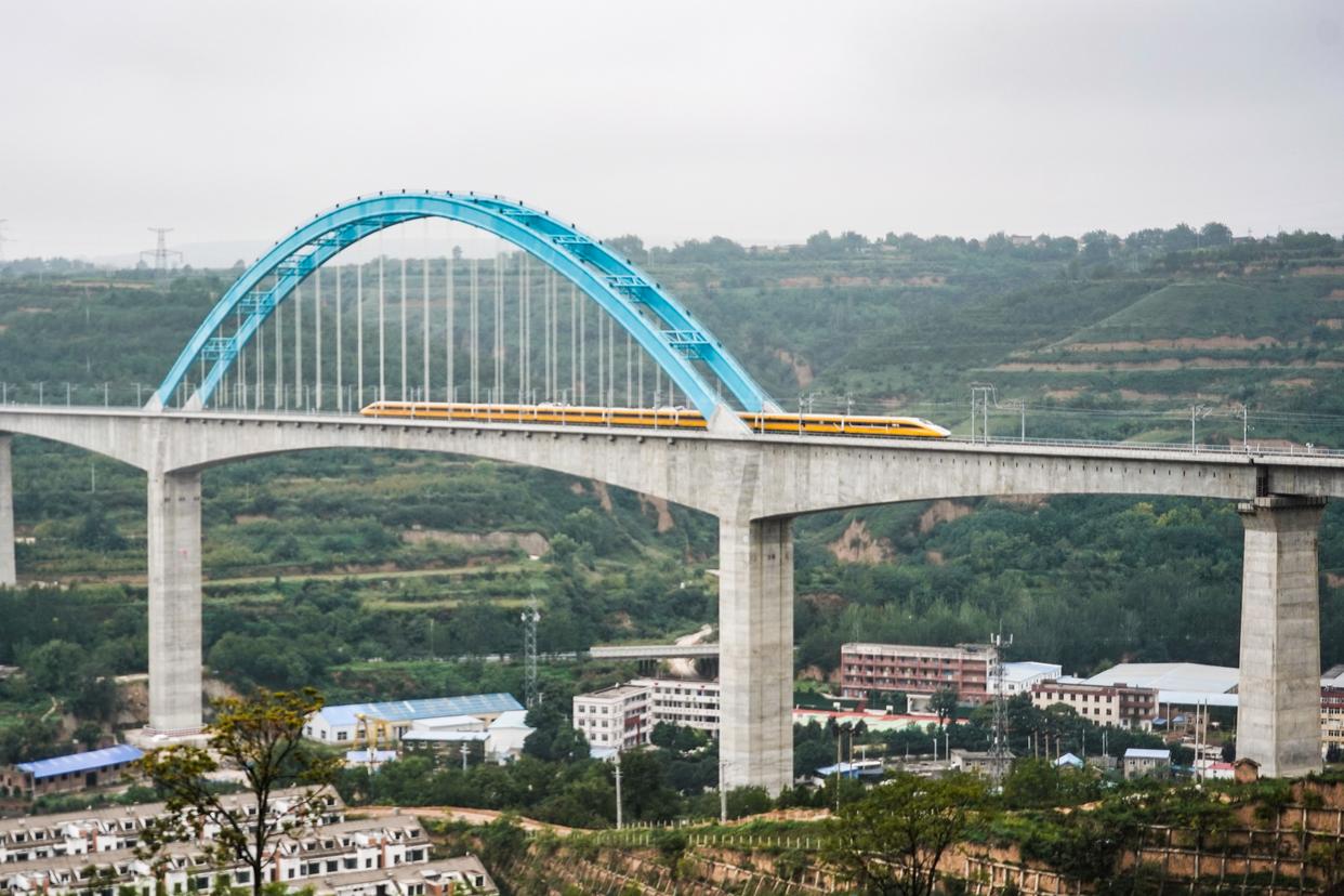 9月11日,联调联试综合检测列车驶过位于陕西省铜川市的西延高铁王家河特大桥。新华社发(刘翔 摄)