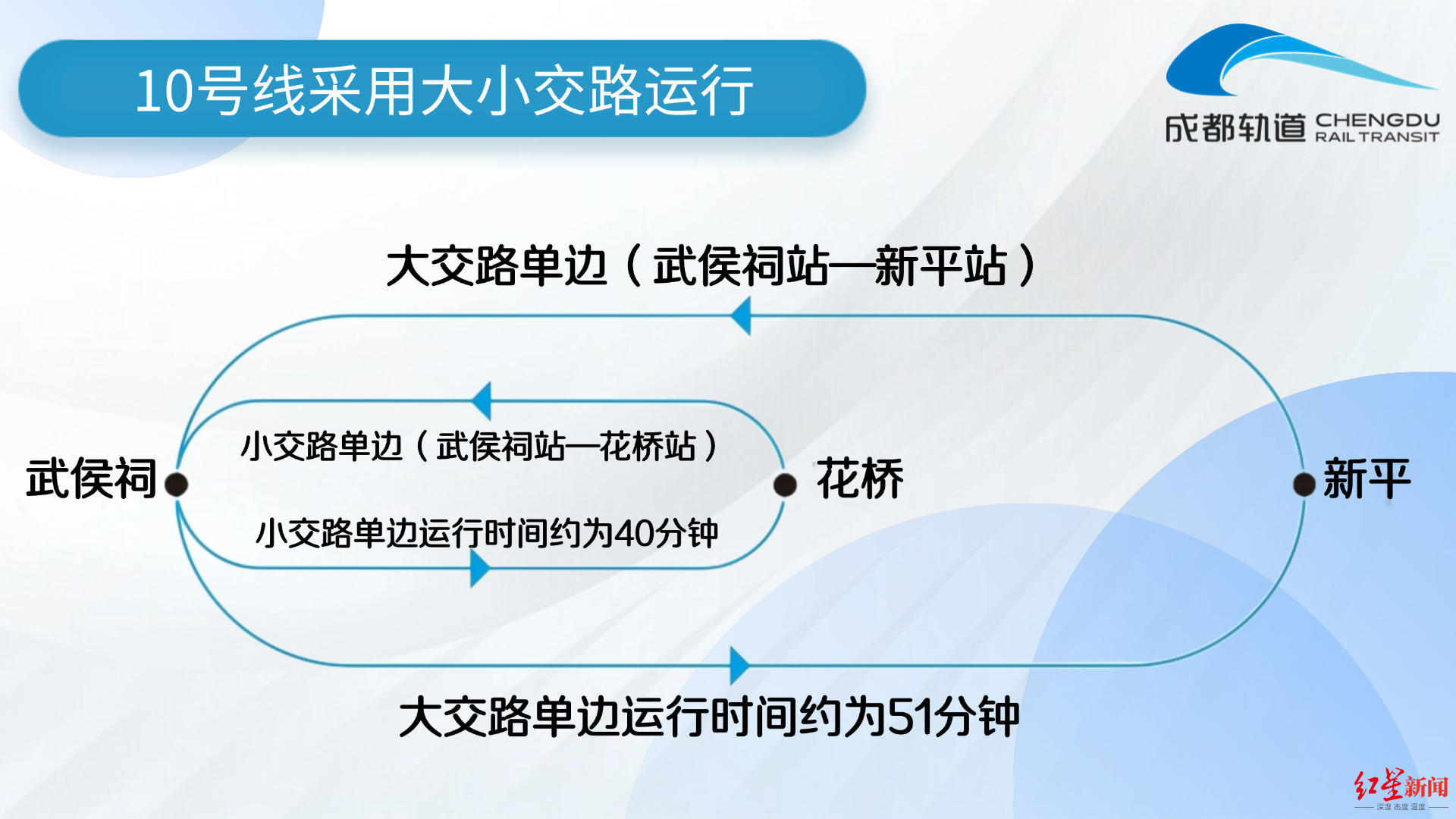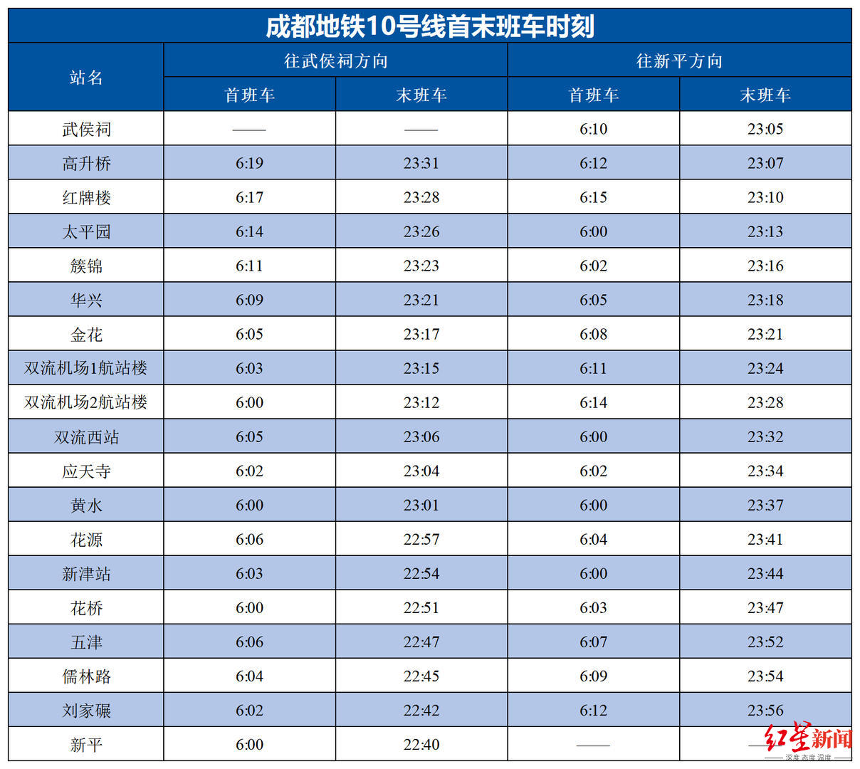10号线三期(武侯祠站-太平园站)开通后,武侯祠站首班车时间为6:10、末班车时间为23:05,新平站首班车时间为6:00、末班车时间为22:40。采用武侯祠站-新平站、武侯祠站-花桥站大小交路运行。