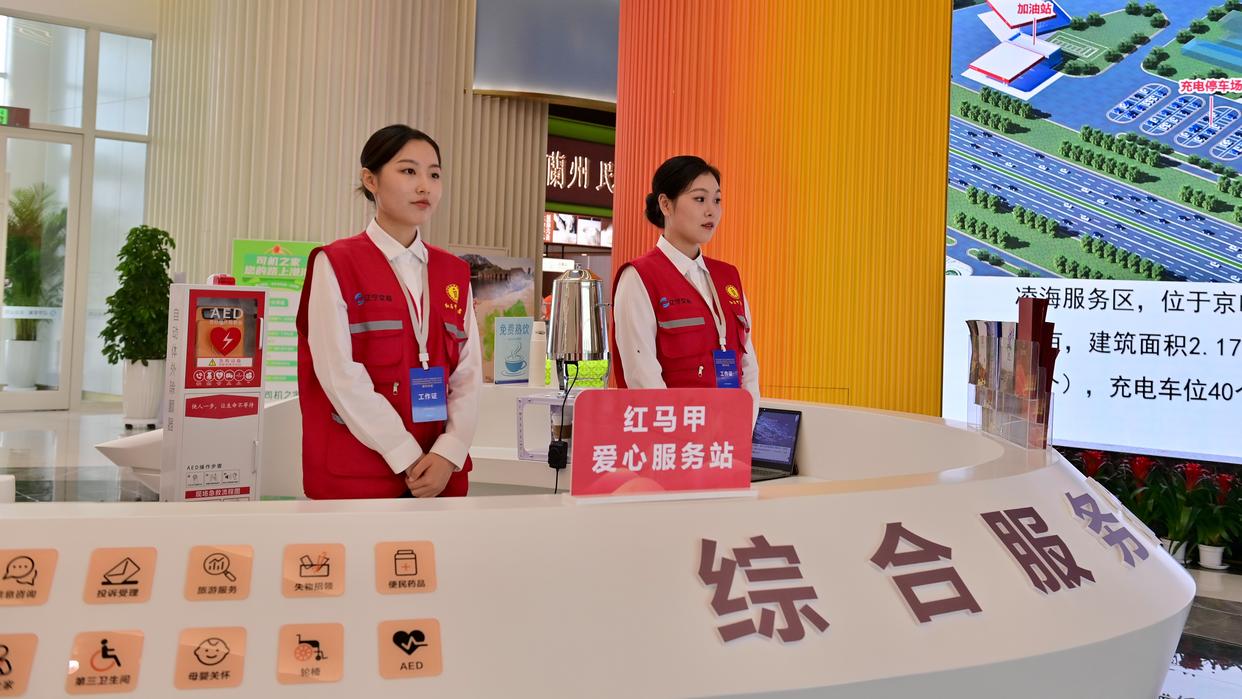 9月27日,在京哈高速哈尔滨方向上的凌海服务区内,红马甲爱心服务站工作人员准备迎接旅客。新华社记者 吴青昊 摄