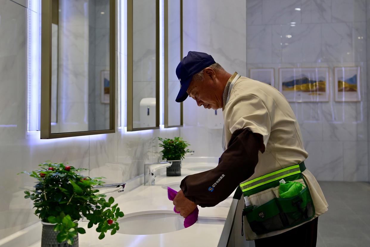 9月27日,在京哈高速哈尔滨方向的凌海服务区,保洁员在工作。 新华社记者 吴青昊 摄