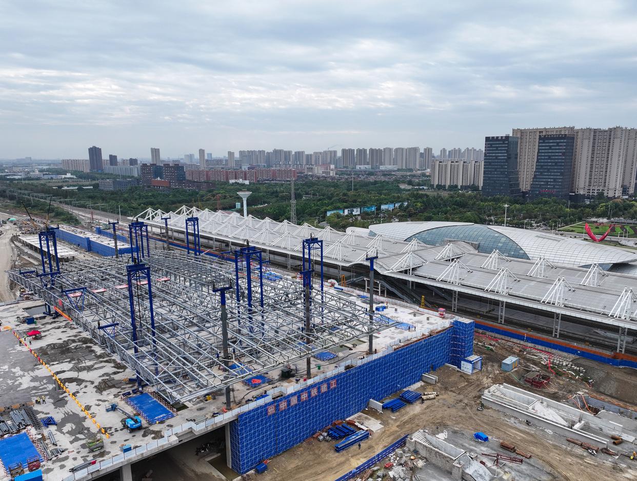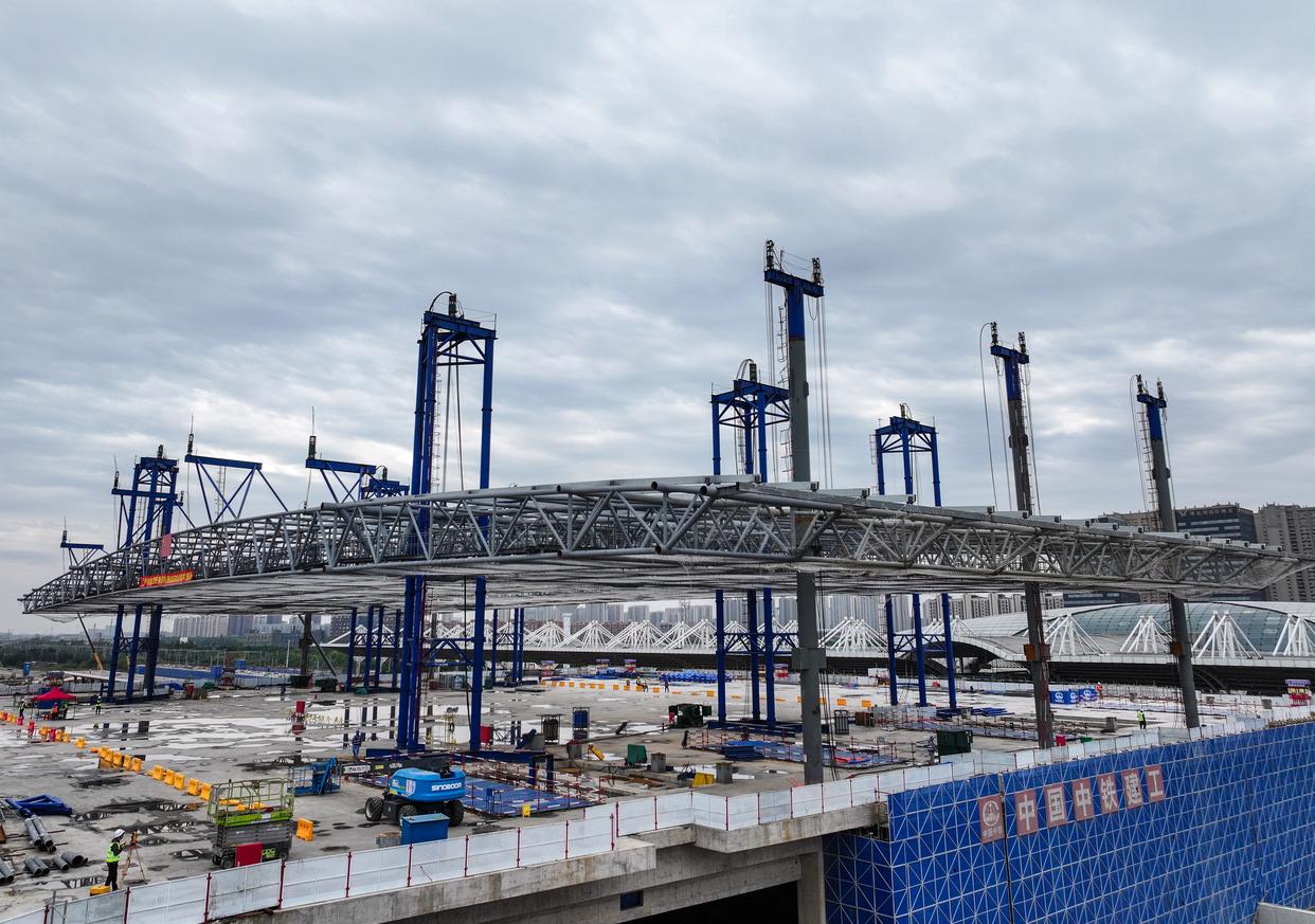 10月19日拍摄的新建上海至南京至合肥高速铁路南通站高架站房钢结构提升作业现场(无人机照片)。新华社记者 季春鹏 摄