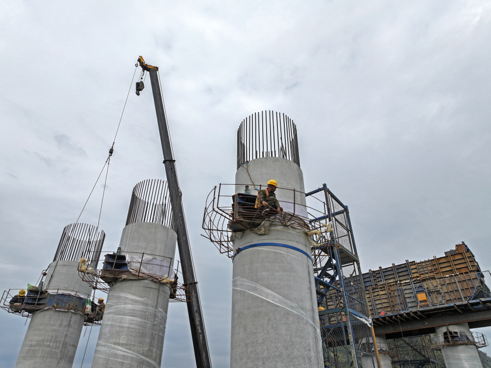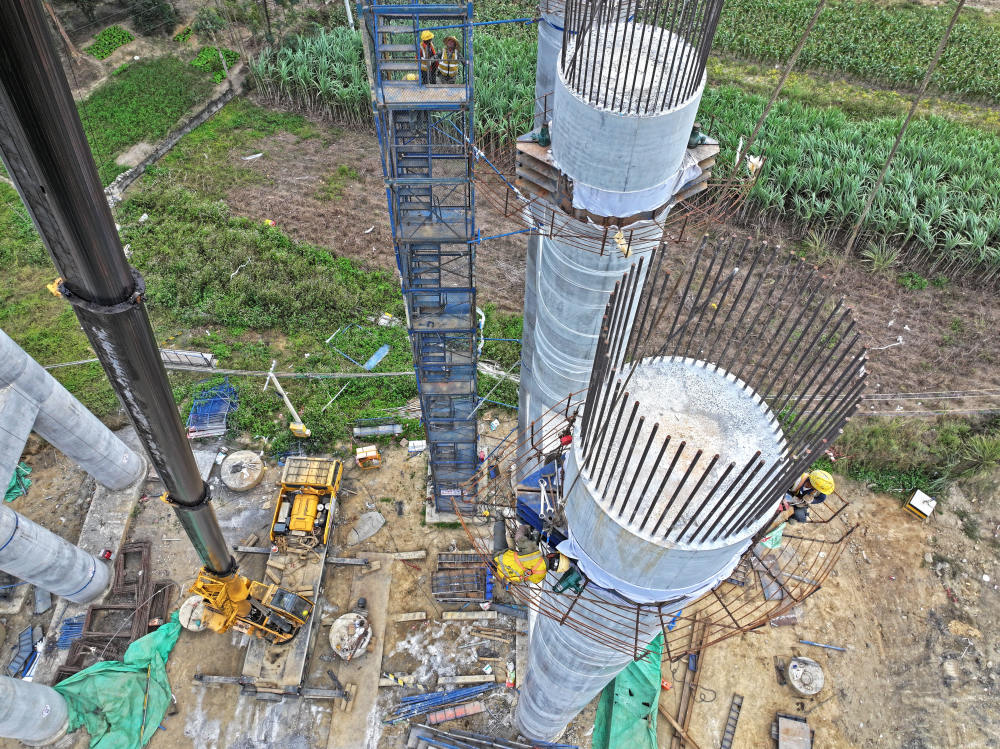 10月23日,中铁十一局的建设者在鱼宜高速公路羊额河大桥工地进行桥梁墩柱施工(无人机照片)。新华社记者 周华 摄