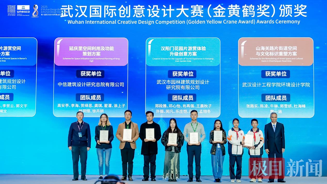 开幕式上,2025年武汉国际创意设计大赛(金黄鹤奖)与2025年国际街区挑战赛颁奖仪式同步举行。其中,象征武汉设计创新探索的“金黄鹤奖”,今年特意选取黄鹤楼、山海关路、汉阳门等市民常去、关注度高、满满烟火气的城市地标作为设计对象,不限专业和地域,征集更宜人的更新提升方案。现场,武汉瑞拓建筑设计咨询有限公司等6个专业组获一等奖和最佳组织奖武汉市七一华源中学等获奖代表接受颁奖。国际街区挑战赛,则是由联合国教科文组织设计之都城市联合举办,全球高校团队共同参与的国际设计赛事。经过全球30位权威专家1个月的精心细致评审,选出了四个优胜方案。现场,为交互设计奖获奖团队武汉大学、美学设计奖获奖团队墨西哥人文大学、社区发展奖获奖团队江汉大学团队和美国劳伦斯理工大学团队,以及综合设计奖获奖团队墨西哥人文大学颁奖。