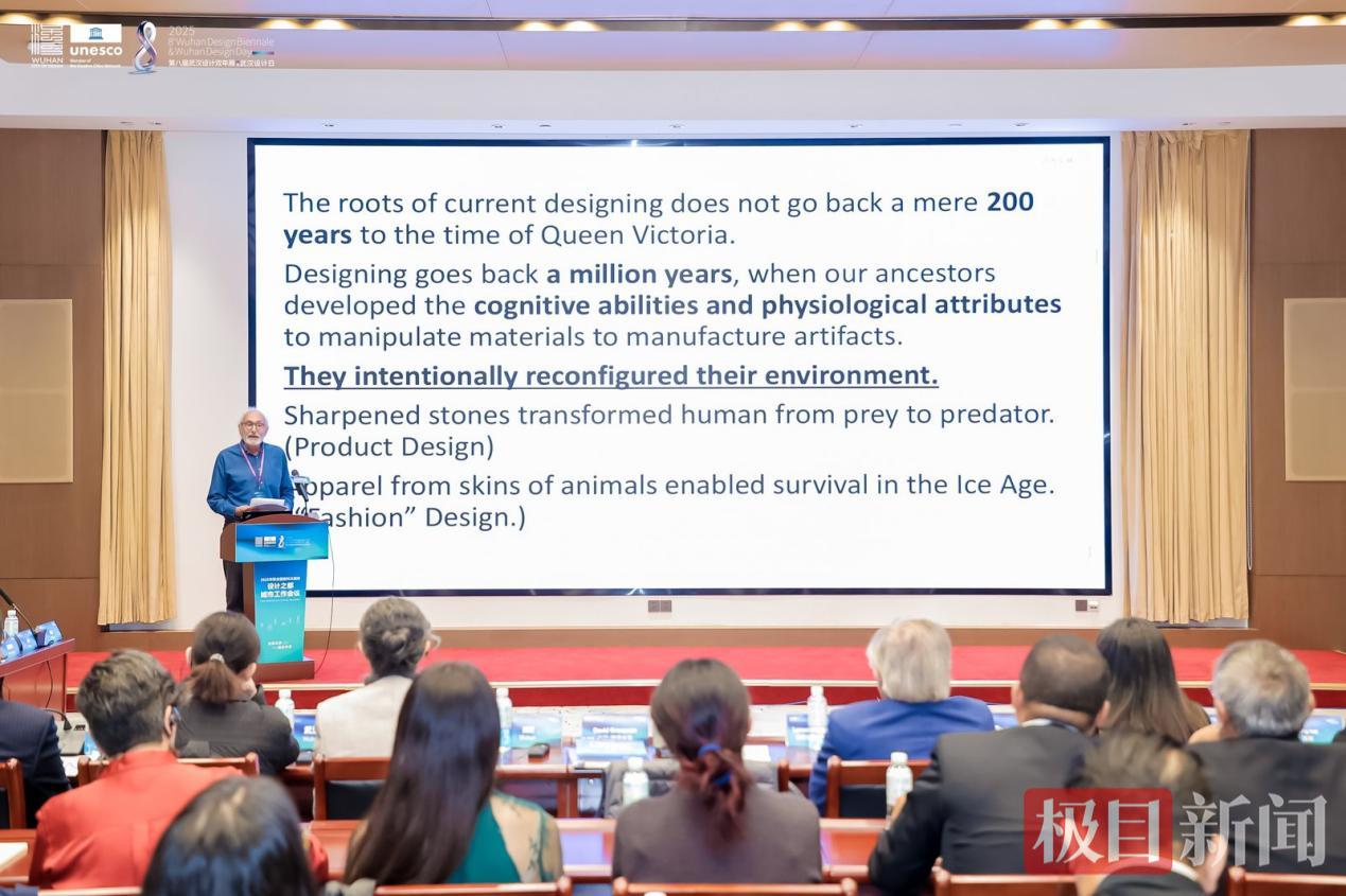在主题分享环节,国际设计理事会前任主席大卫·格雷丝曼发表题为《厘清之必要:人工智能时代的设计、创意、工作与专业精神》的演讲。他指出,AI能够极大提高设计效率、释放创意潜能,但科技的进步从来不会削弱设计的价值。设计不仅是商业手段,更是一种改善人类生活的社会力量。从早期人类打磨石器、制作衣物起,设计就已存在,其核心始终是“为生活而创造”。