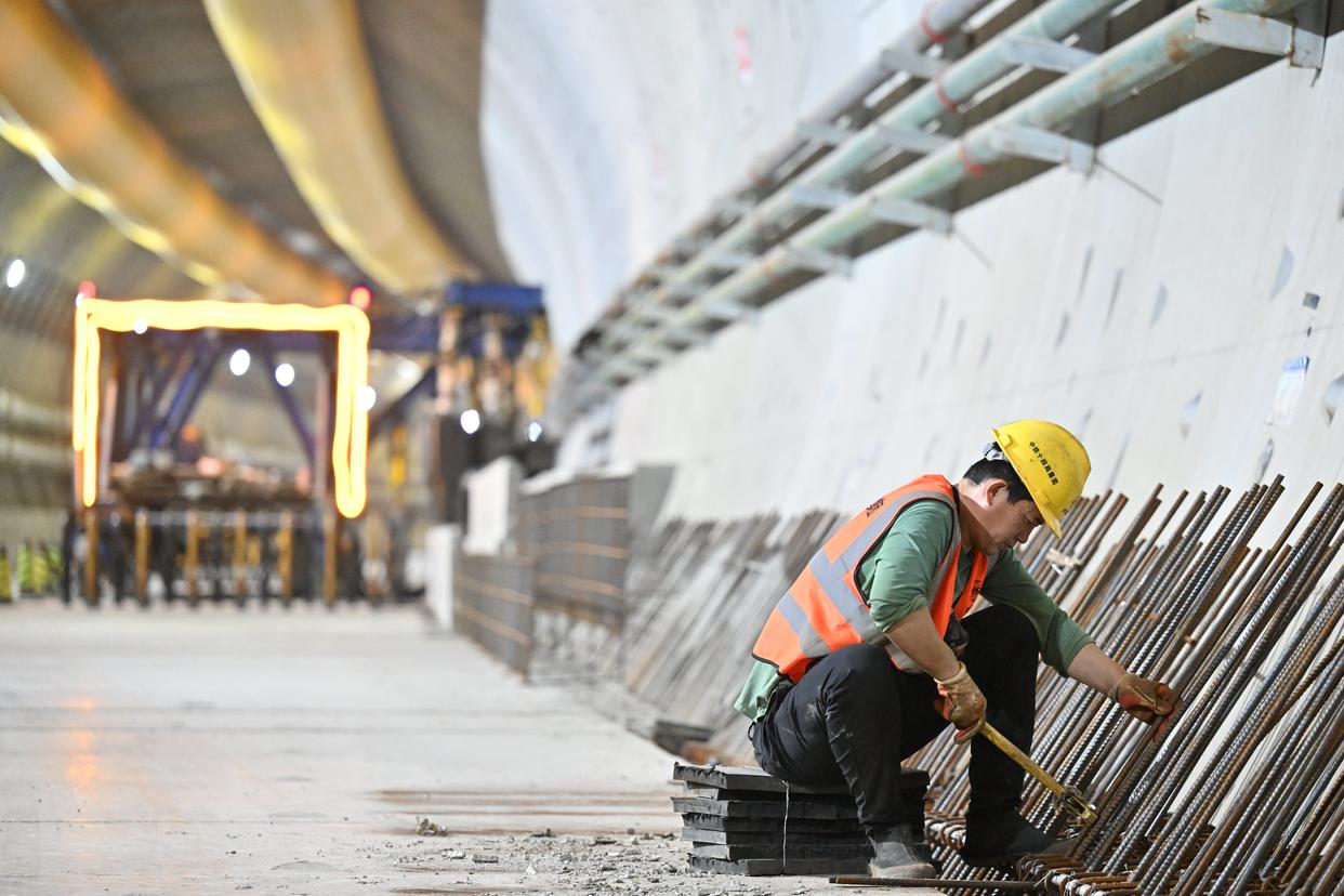 11月27日,中铁十四局的建设者在津潍高铁津沽海河隧道内施工。新华社记者 李然 摄