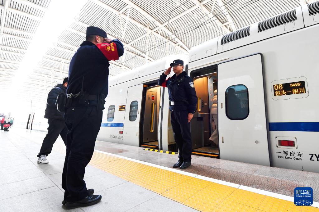 12月23日,在银川火车站,银川铁路公安处民警在包银高铁首发列车D4667次动车组前进行接车仪式。新华社发(王永飞 摄)
