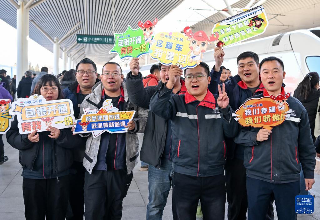 12月23日,参建者在包头站与包银高铁首发列车D4667次动车组合影。新华社记者 李志鹏 摄
