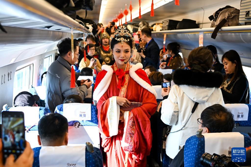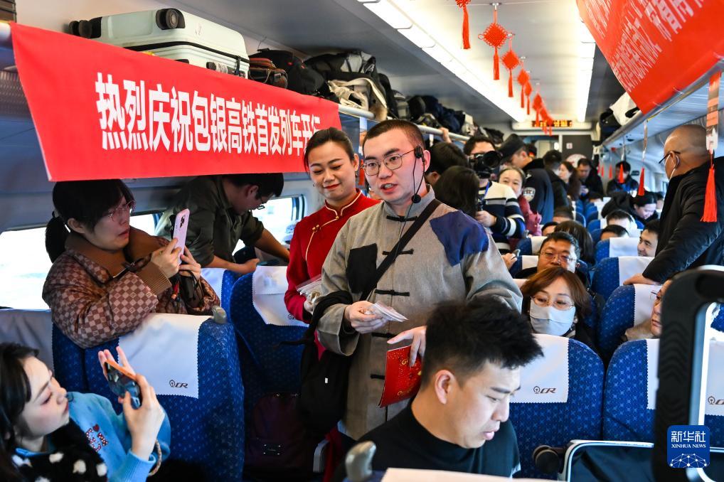 首发动车组车厢内洋溢着喜庆气氛,行李架上悬挂着沿线景观挂饰,车窗上贴着蒙宁地区的标志性建筑窗花。“高铁绘蓝图·塞北谱新篇”主题联欢活动同步开展,马头琴声与欢声笑语回荡在车厢。