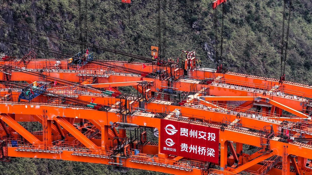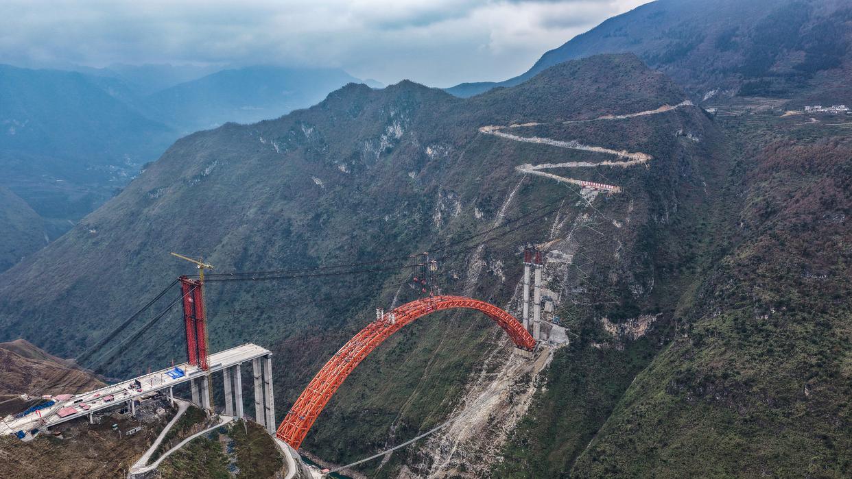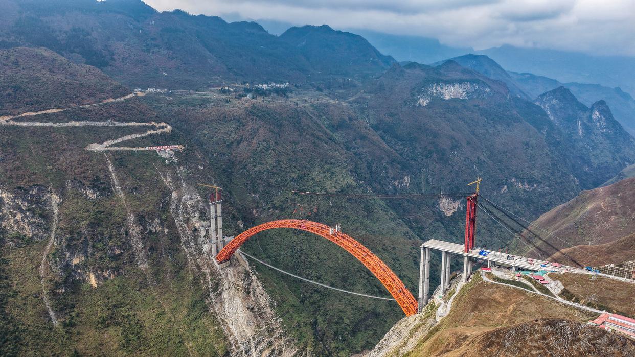 1月5日,随着最后一节钢拱精准吊装到位,贵州交投集团承建的安顺至盘州高速公路古牛河特大桥顺利合龙,为后续工程建设推进奠定了坚实基础。古牛河特大桥是安盘高速控制性工程,全长881.8米,主桥横跨古牛河,主桥桥面到谷底高度约400米。
