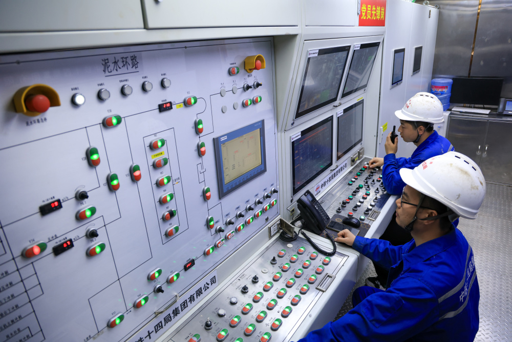 1月6日,中铁十四局施工人员在“深江1号”盾构机操作室控制设备运行。新华社记者 毛思倩 摄