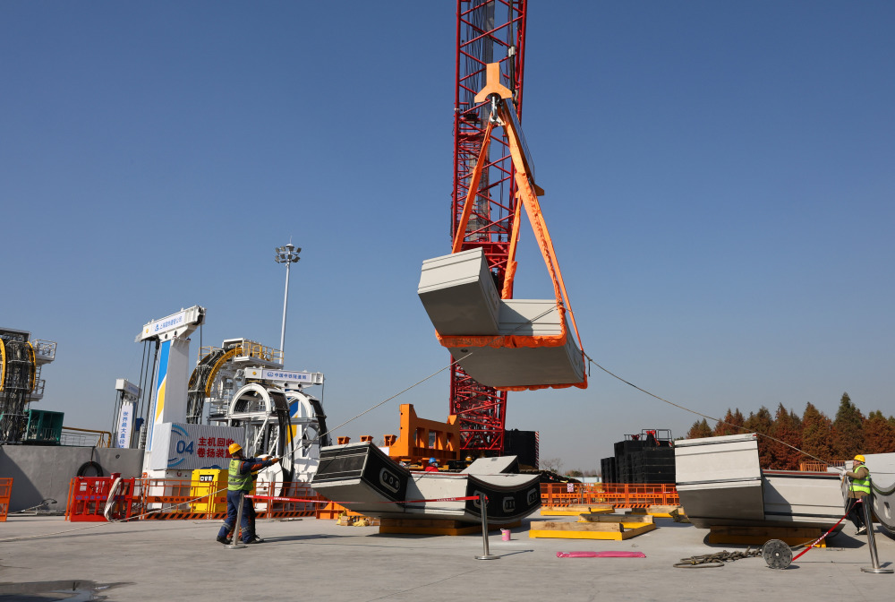 1月13日,在崇太长江隧道2号竖井项目施工现场,工人辅助吊机进行翼形管片吊装作业。新华社记者 方喆 摄