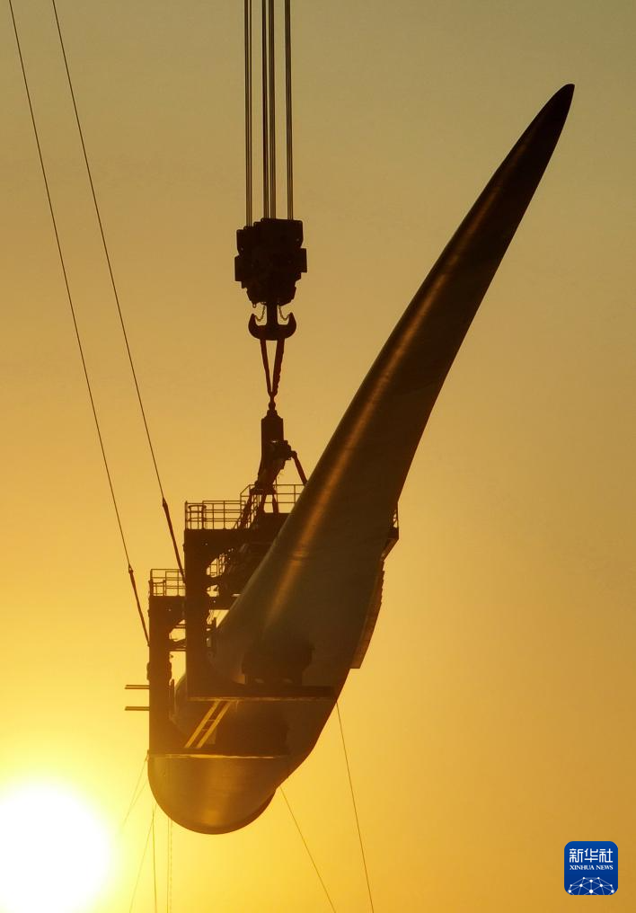 1月13日,在“大桥海风”号2000吨自升式海上风电安装平台上,20兆瓦风机叶片在进行吊装(无人机照片)。