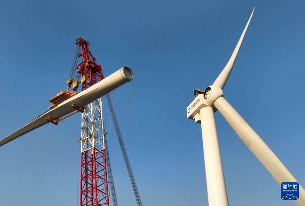 这是1月13日拍摄的20兆瓦风电机组叶片吊装现场(无人机照片)。