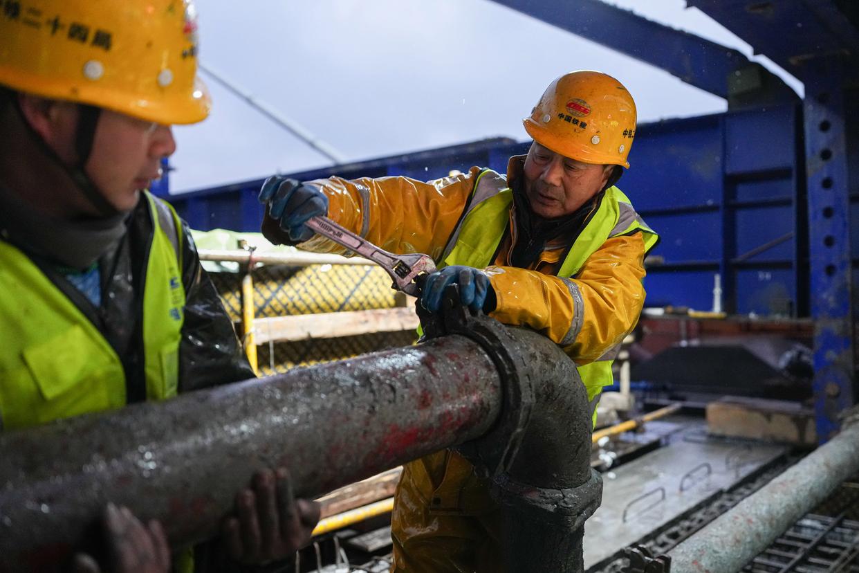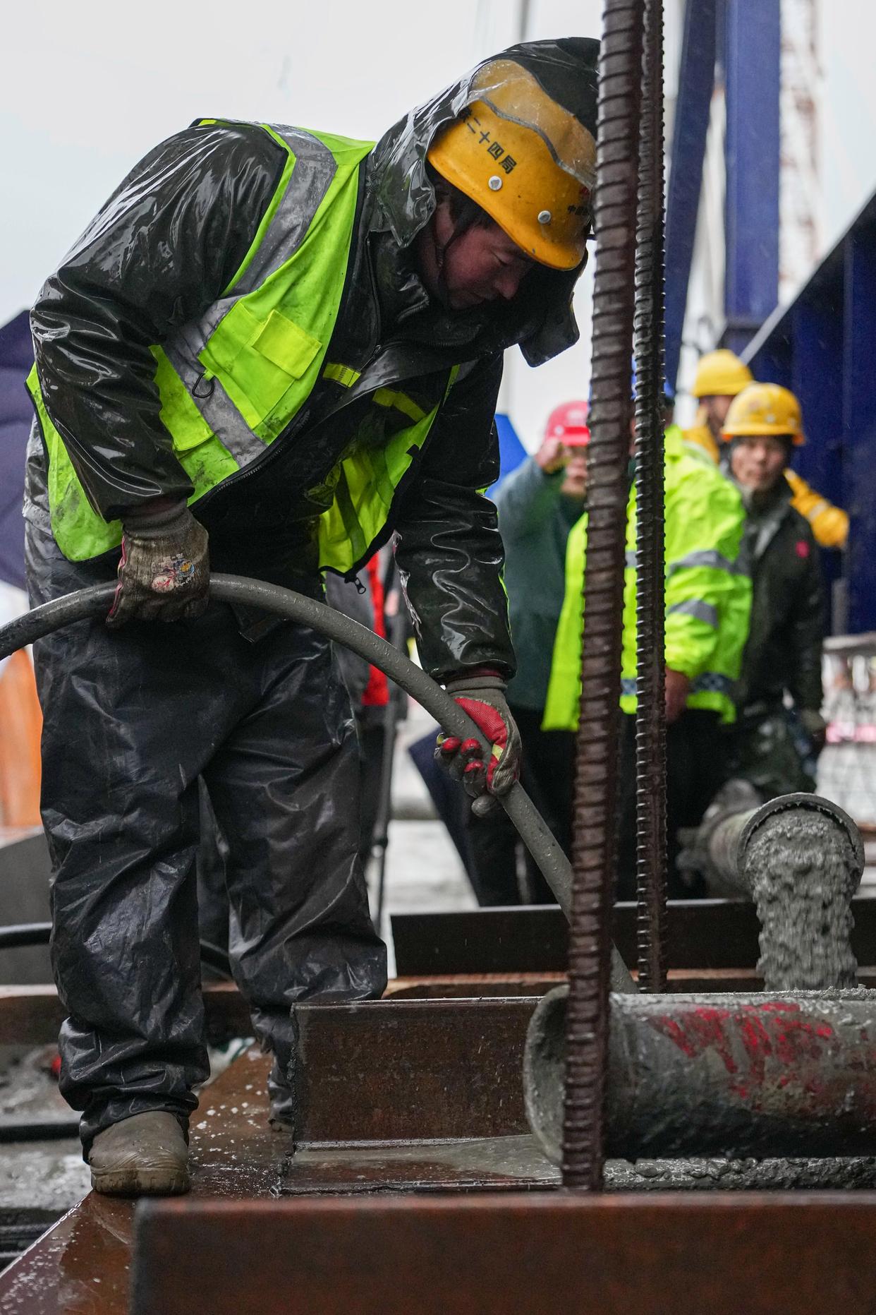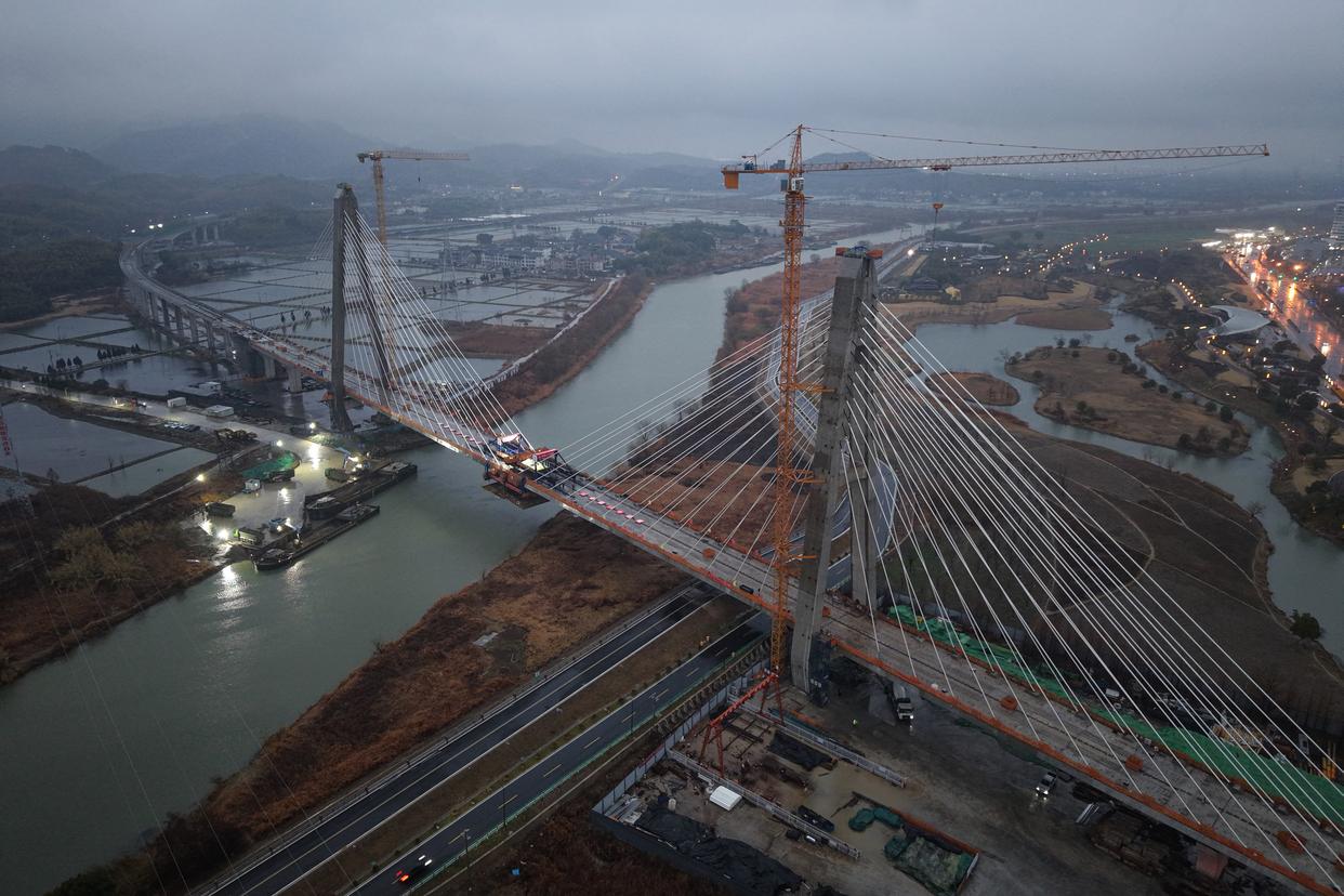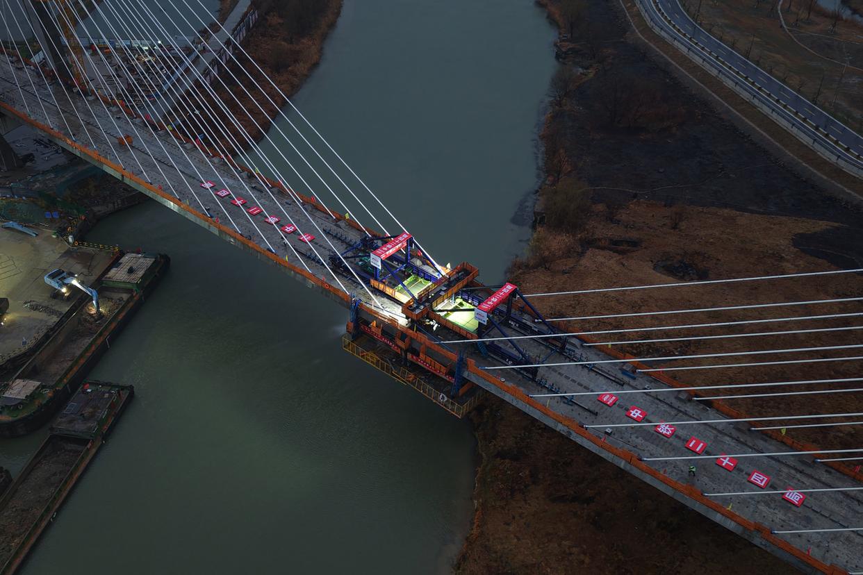 1月30日,中铁二十四局建设者在杭州至德清市域铁路跨东苕溪斜拉桥合龙施工现场作业。新华社记者 黄宗治 摄