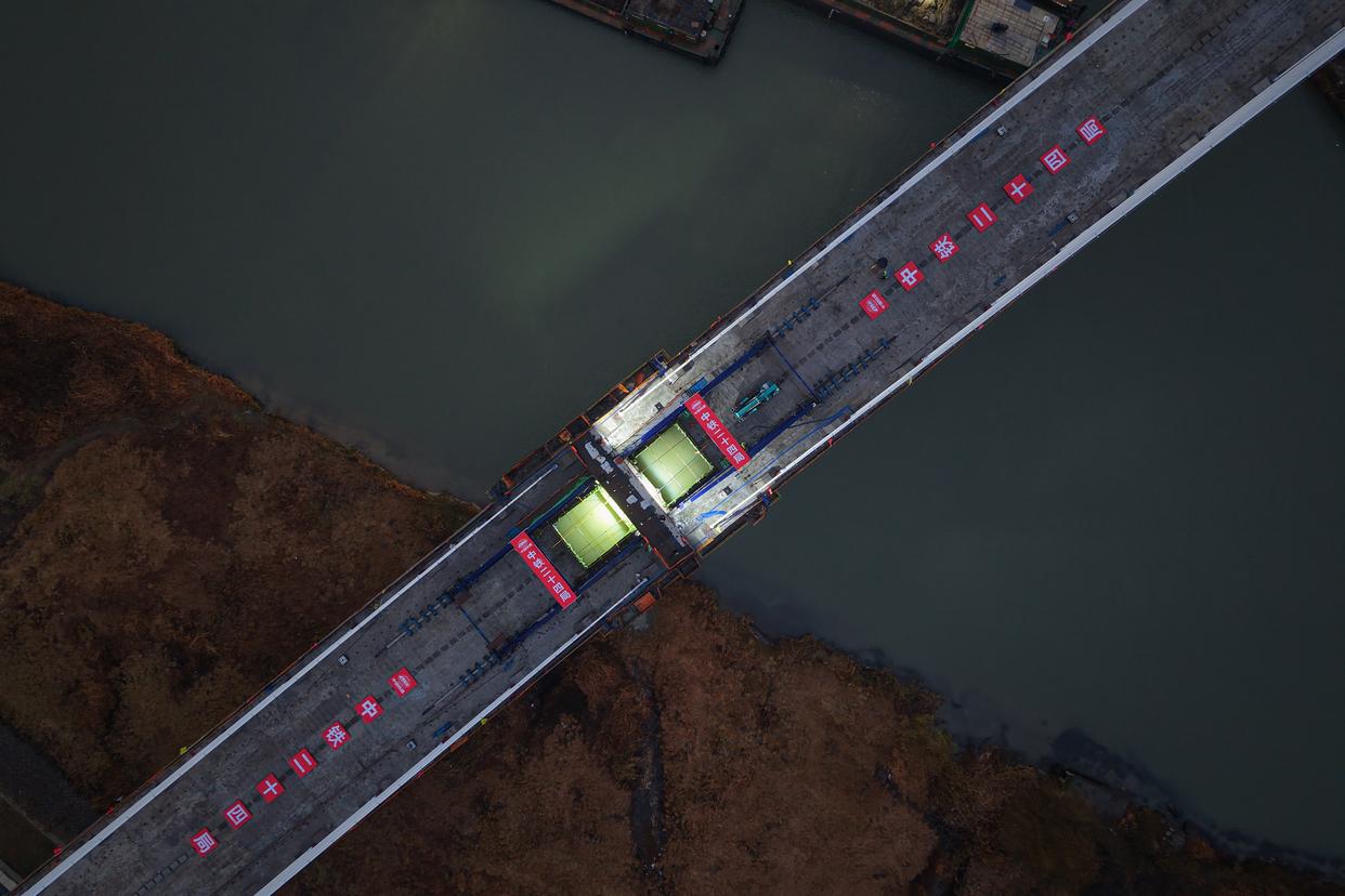 1月30日拍摄的杭州至德清市域铁路跨东苕溪斜拉桥合龙施工现场(无人机照片)。新华社记者 黄宗治 摄