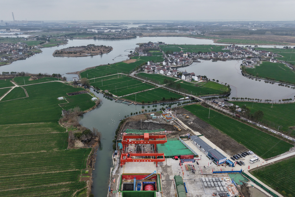 3月4日在浙江省嘉善县西塘镇拍摄的“水乡先锋号”盾构始发井(无人机照片)。新华社记者 黄宗治 摄
