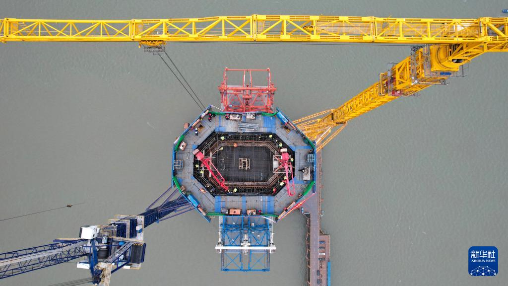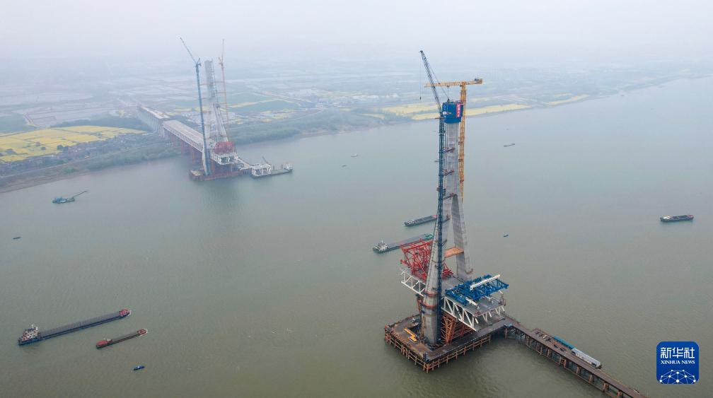 3月19日拍摄的池州长江公铁大桥北主塔封顶施工现场(无人机照片)。新华社记者 曹力 摄