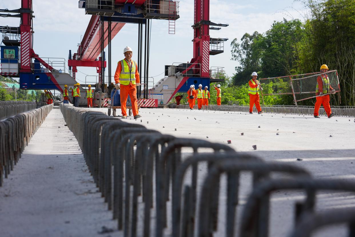 4月17日,工人在西渝高铁双碉楼特大桥进行架梁作业。新华社记者 王曦 摄