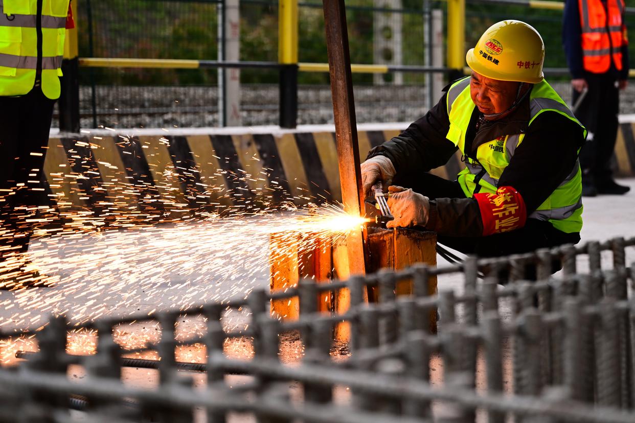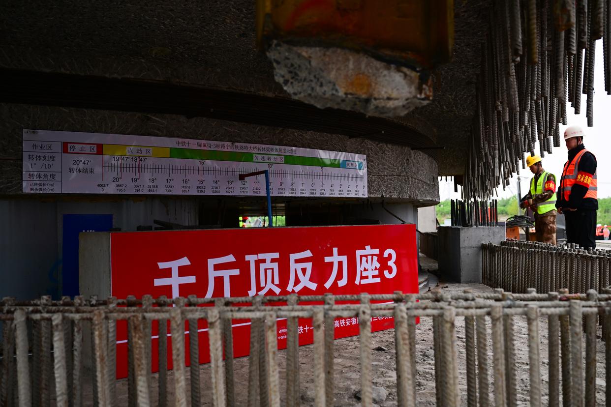 4月21日,中铁十一局工人在合武高铁跨宁西铁路万吨连续梁转体施工现场忙碌。 新华社记者 刘军喜 摄