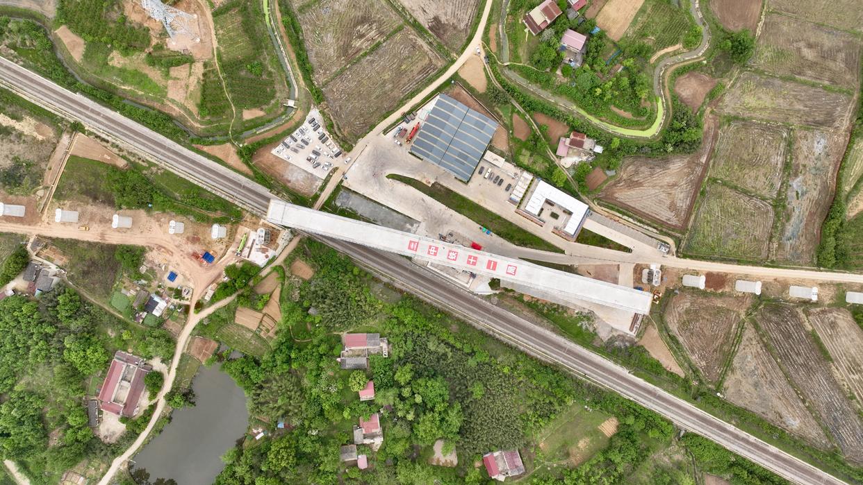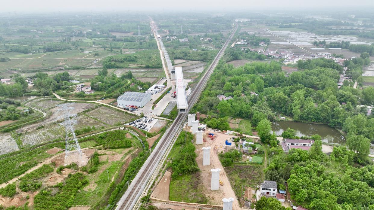 4月21日拍摄的合武高铁跨宁西铁路万吨连续梁转体施工现场(无人机照片)。 新华社记者 周牧 摄