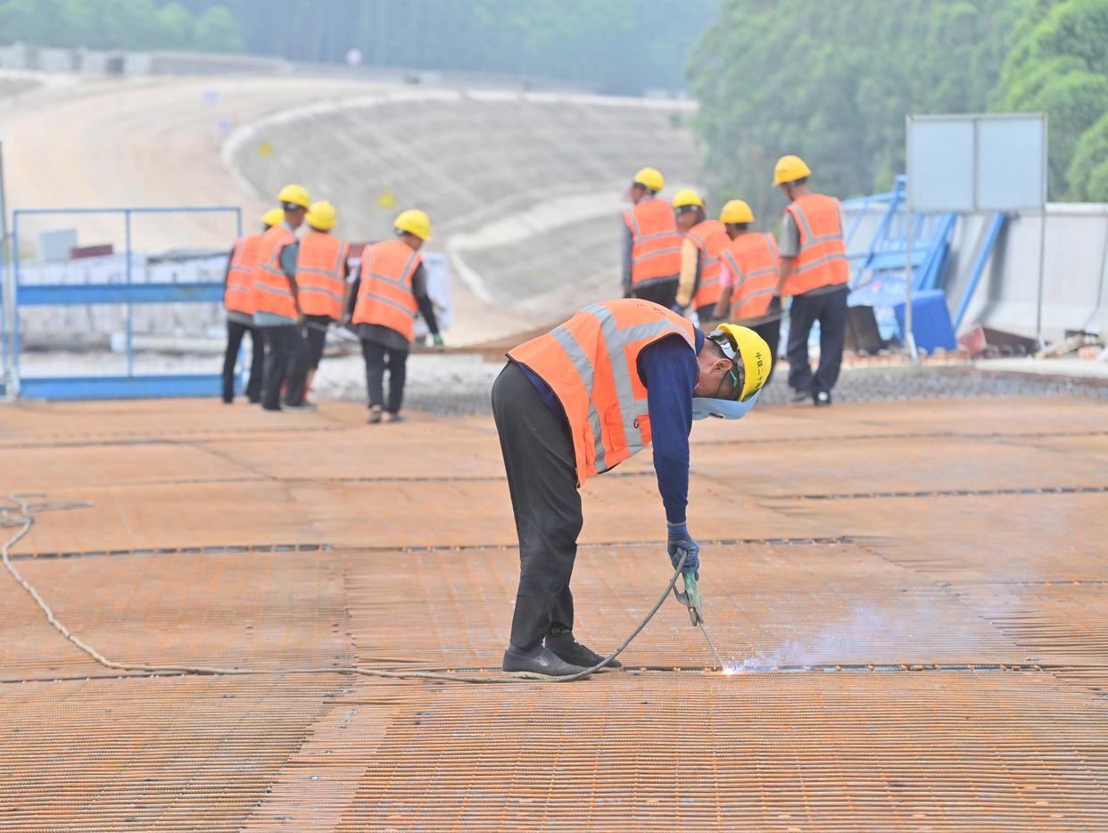 4月21日,中铁二十局的工人在来宾市兴宾区寺山镇柳覃高速公路建设工地作业。新华社记者 黄孝邦 摄