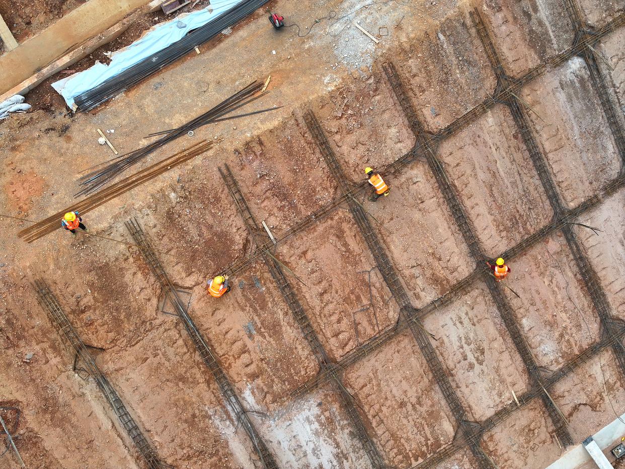 4月21日,中铁二十局的工人在来宾市兴宾区寺山镇柳覃高速公路建设工地作业(无人机照片)。新华社记者 黄孝邦 摄