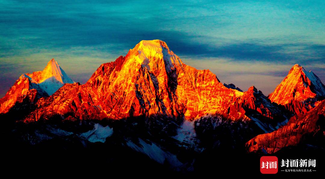 在玛娜茶金观景平台,可近观仙乃日、央迈勇、恰朗多吉三座雪山,极其壮观。图为日照金山景象。陈进摄