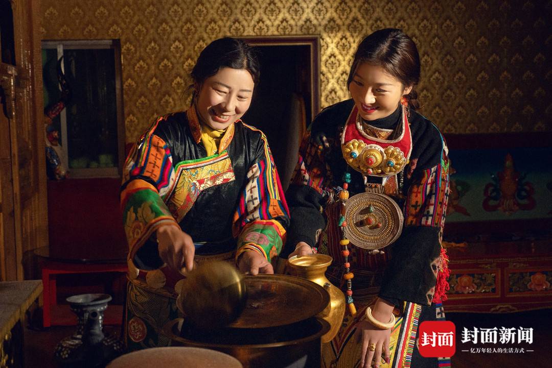 木里藏族服饰丰富多彩、美观大方、极具特色。图为两名身着藏族服装的女子在制作美食。张梁摄