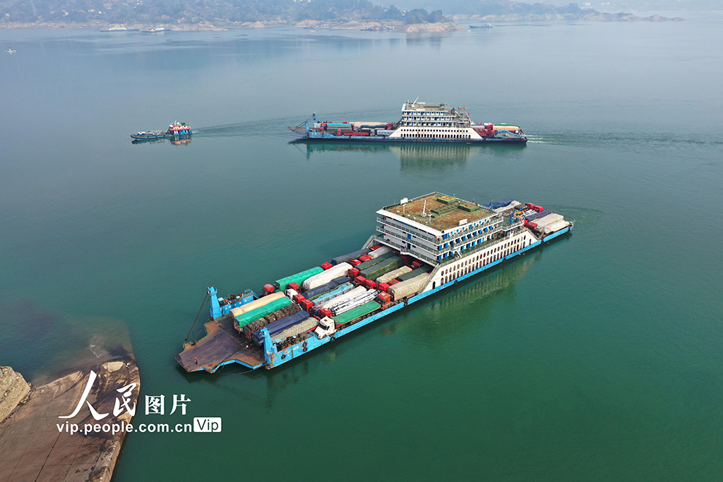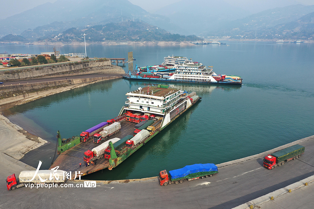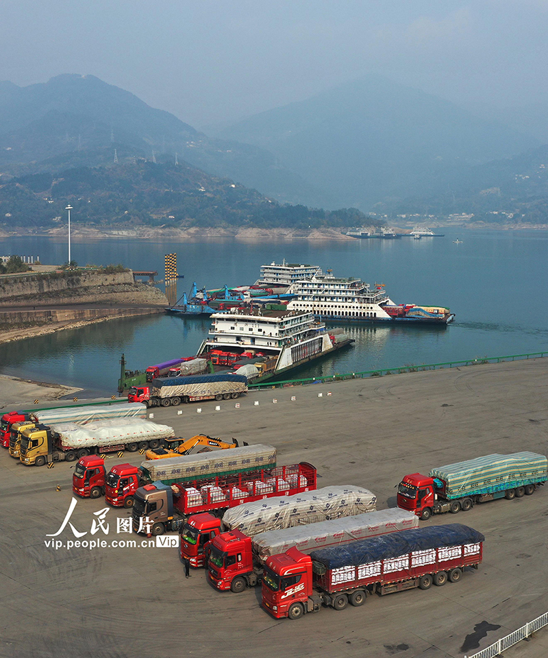 2022年12月7日拍摄的湖北省宜昌市秭归县茅坪镇银杏沱滚装码头一派忙碌。2艘滚装船各自满载45辆大型货车同时离开码头前往重庆,1艘滚装船正在装载大型货车。今年以来湖北省宜昌市三峡库区滚装船运输吞吐量持续走高,货车运输量及货物吞吐量均创历史新高。三峡库区滚装船运输是三峡翻坝运输的重要补充部分,进入四川、重庆的车辆在忠县和奉节码头搭乘滚装船在三峡大坝上游银杏沱滚装码头上岸,进入高速通往全国各地。而全国各地的重载货车在银杏沱滚装码头登船分别在忠县、奉节上岸进入重庆、四川等地。黄善军摄(人民图片网)