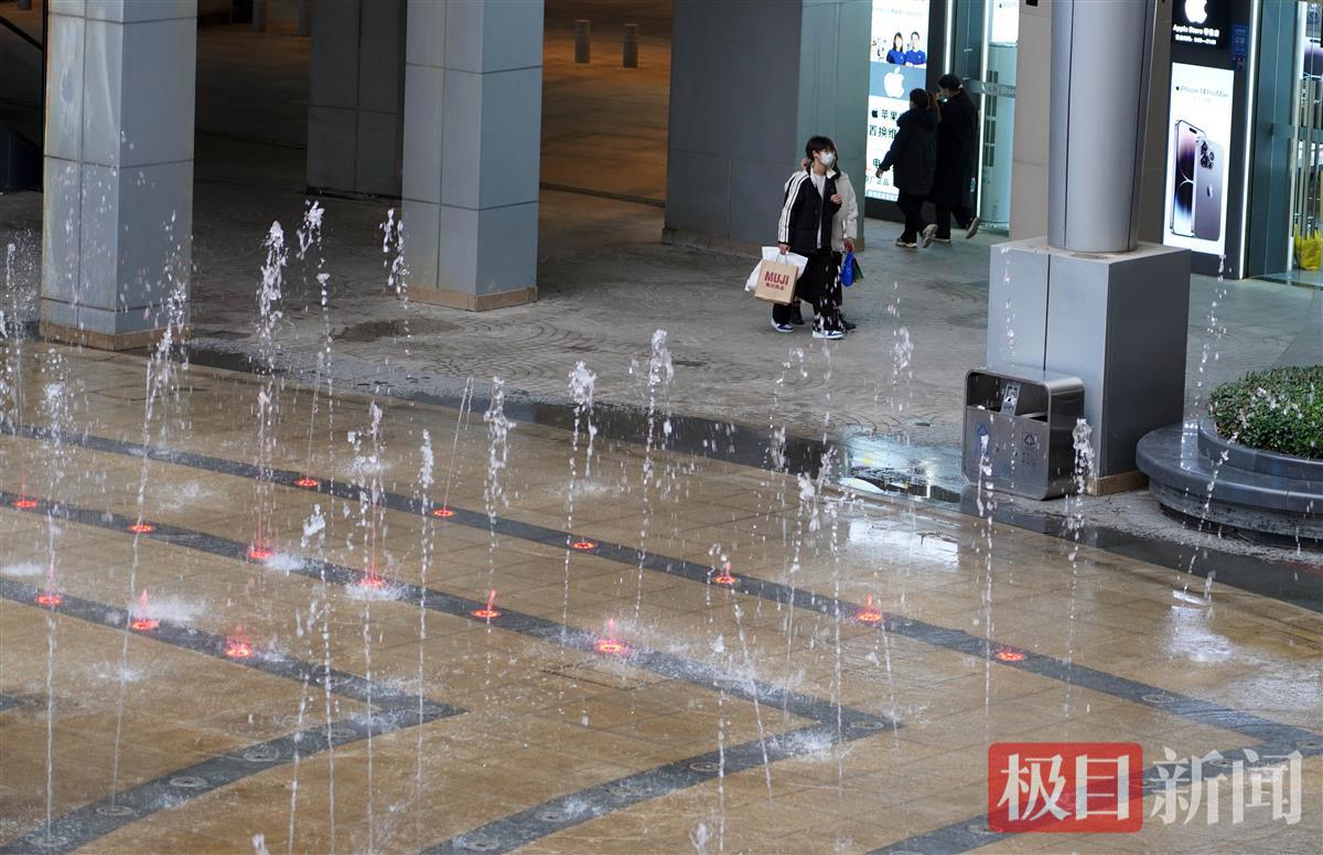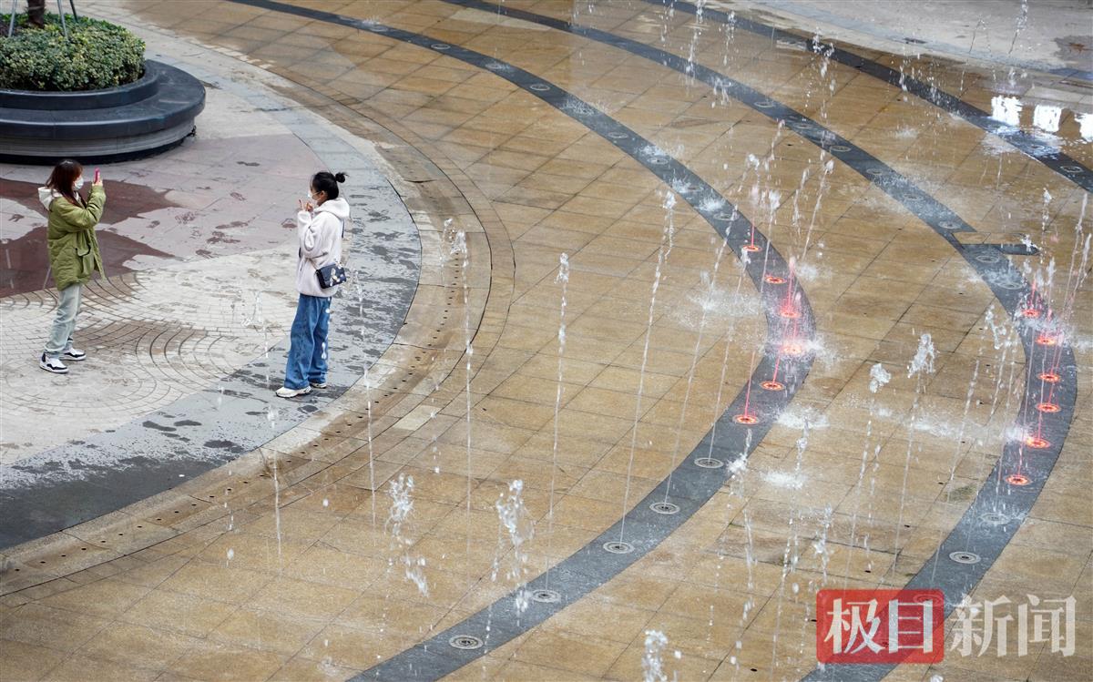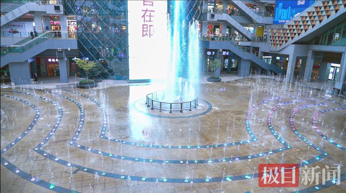 在现场,光谷喷泉广场位于光谷步行街一期的下沉式广场,音乐响起,水柱从广场地面的数百个孔中喷射而起,流光溢彩,并随着音乐跌宕起伏。时而是细密水珠欢快跳跃,时而是水柱冲天、大气磅礴,高昂的旋律带着游客似在看一场激扬的演唱会。