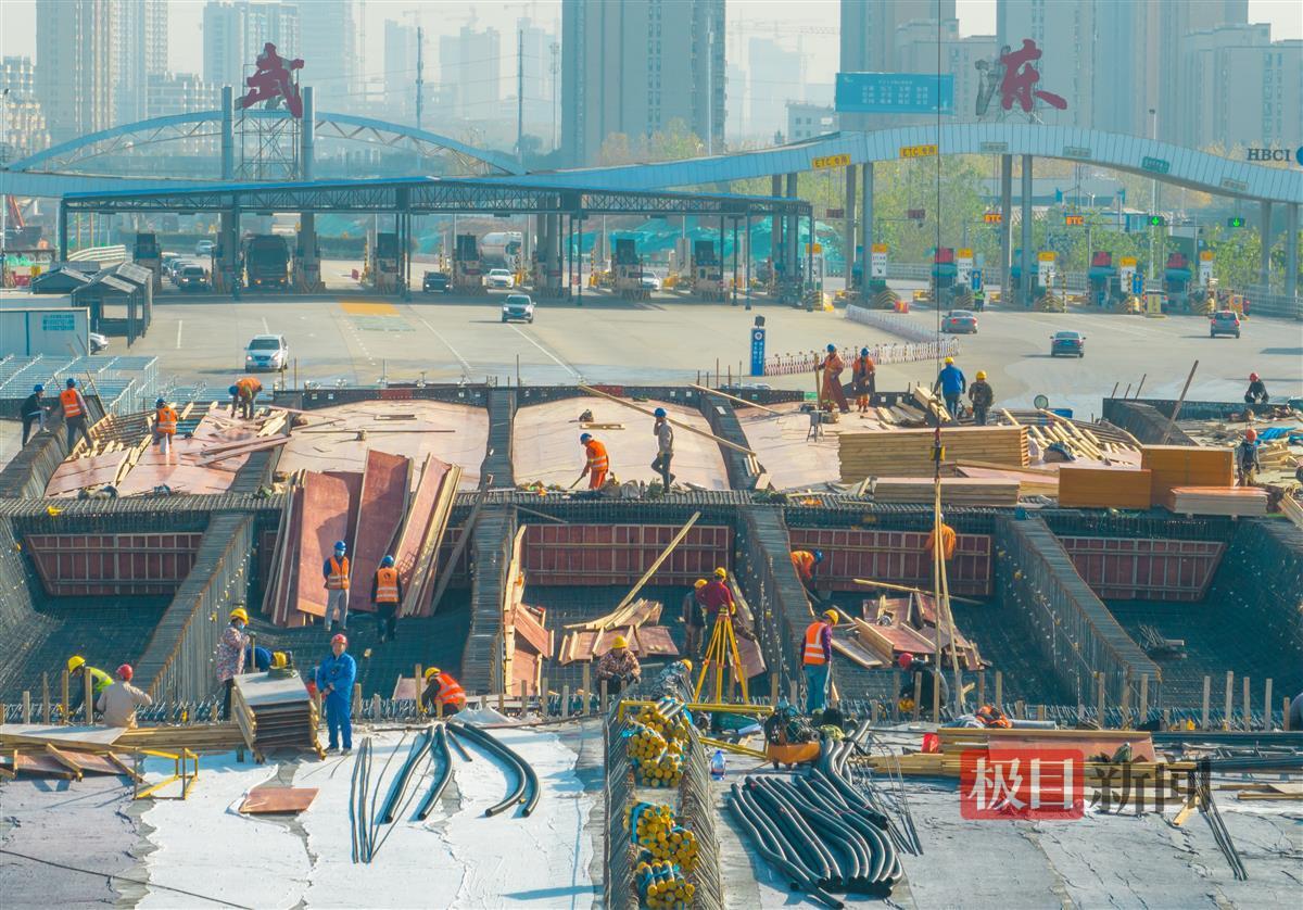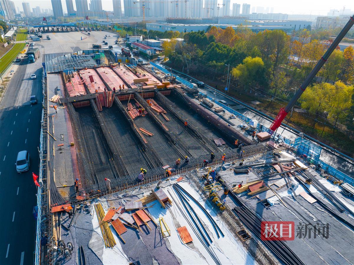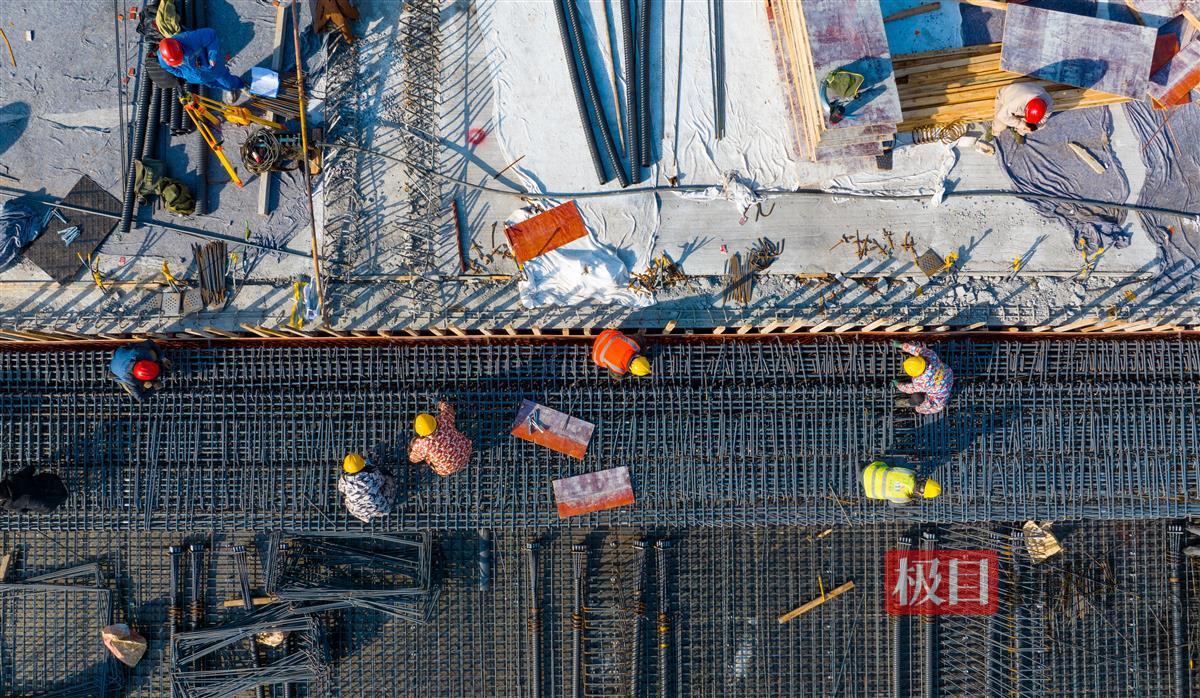 12月14日,俯瞰武汉东湖高新区高新三路改造工程施工现场,工人们正在高架桥上紧张施工。