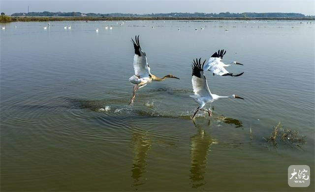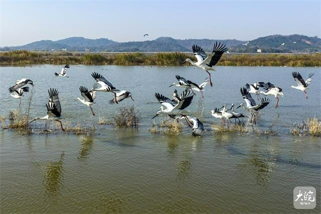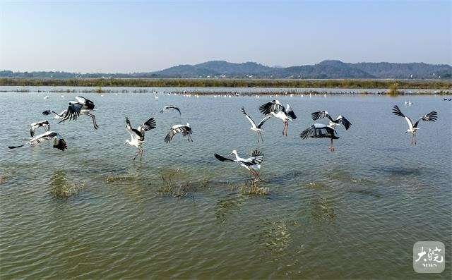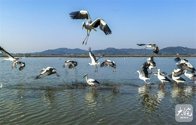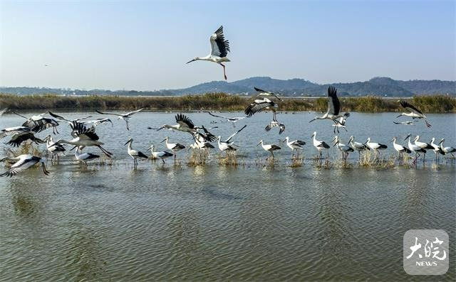 入冬以来,东方白鹳、白鹤等大量珍稀候鸟飞抵庐江县黄陂湖湿地。近年来,庐江县加大力度对黄陂湖湿地生态环境保护,湿地生态环境得到较大改善,每年冬季吸引数以万计的鸟类来此越冬。