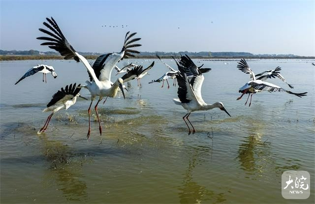 大皖新闻讯12月15日,国家一级保护动物东方白鹳在合肥市庐江县黄陂湖湿地浅滩嬉戏、觅食,自由飞翔。